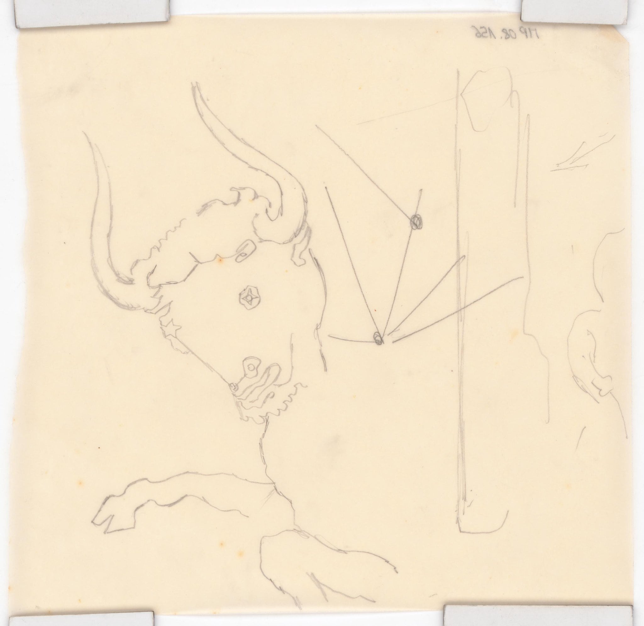Projet pour les vitraux sur le thème de la "carte du ciel": personnification du signe du Taureau, représenté de profil et uniquement le buste, avec croquis des constellations.