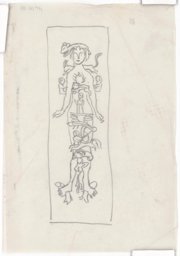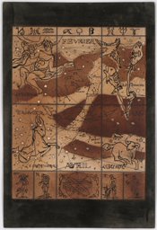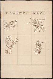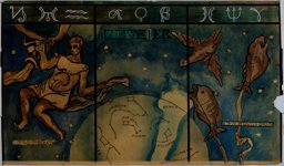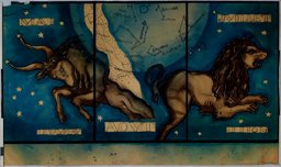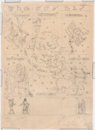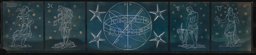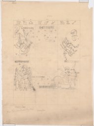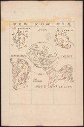 Projet en couleur pour les vitraux sur le thème de la "carte du ciel" : les personnifications des signes des Gémeaux, à gauche, et du Cancer, à droite, autour d'un cercle central comprenant les constellations, (dont seule la moitié supérieure est dessinée ici). La personnification de la constellation de la Licorne est représentée en bas à gauche, et celle de la constellation du Compas en haut à droite. Au sommet, on trouve les symboles des signes du zodiaque. (L'ensemble est complété par MP 08.170). Au verso : projet pour les vitraux sur le thème de la "carte du ciel" des Pressoirs du Roy de Fontainebleau (non réalisés): les personnifications des signes de la Vierge, à gauche, et des Poissons, à droite, autour d'un cercle central comprenant les constellations, (dont seule la moitié supérieure est dessinée ici). En haut à droite, on aperçoit la personnification de la constellation du Corbeau, et au sommet, les symboles des signes du zodiaque (l'ensemble est complété par le verso du MP 08.170).