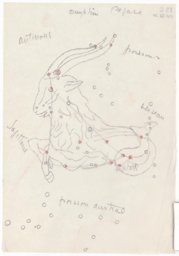 [A l'intérieur du demi-cercle :] LION // Capella // Algol / TRIAN[GLE] / COCHER // PERSEE // Castor / Pollux // PLEIADES /CANCER // GEMEAUX // TAUREAU // BELIER // POISSONS / Regulus // Ecliptique / LE Pt CHIEN / Bételgeuse / Procyon // ORION // Equateur / Rigel / Horizon sud // ERIDAN