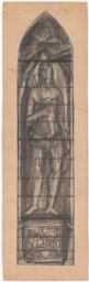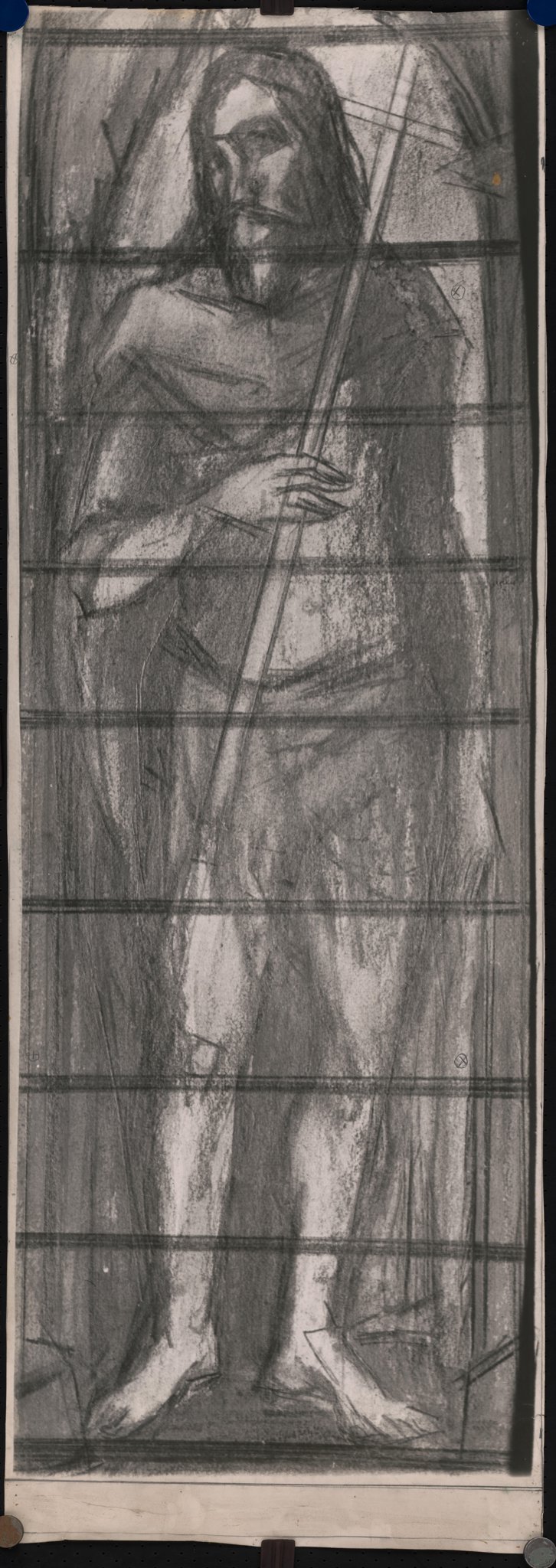 Photographie de la maquette ou du carton du vitrail de saint-Jean-Baptiste de Neuchâtel : le saint debout en pied, tenant son bâton en forme de croix.