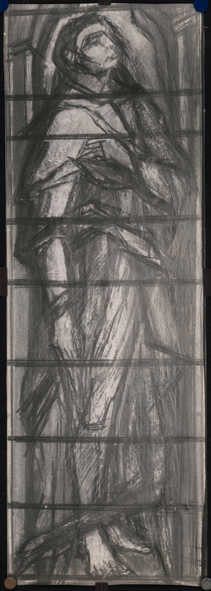 Photographie de la maquette du vitrail de Daniel de Neuchâtel : le saint debout en pied, levant la tête vers le ciel, une main sur la poitrine.