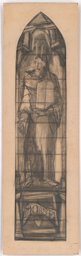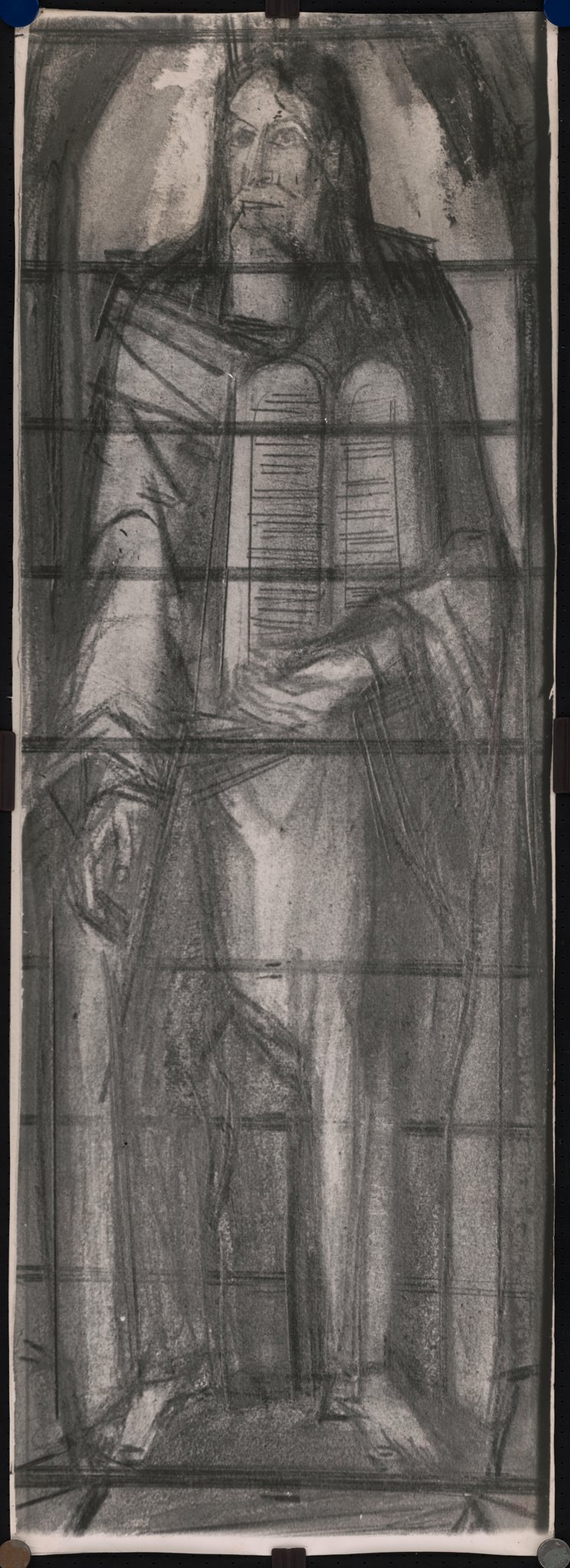Photographie de la maquette du vitrail de Moïse de Neuchâtel : le saint debout en pied, tenant les tables de la Loi.
