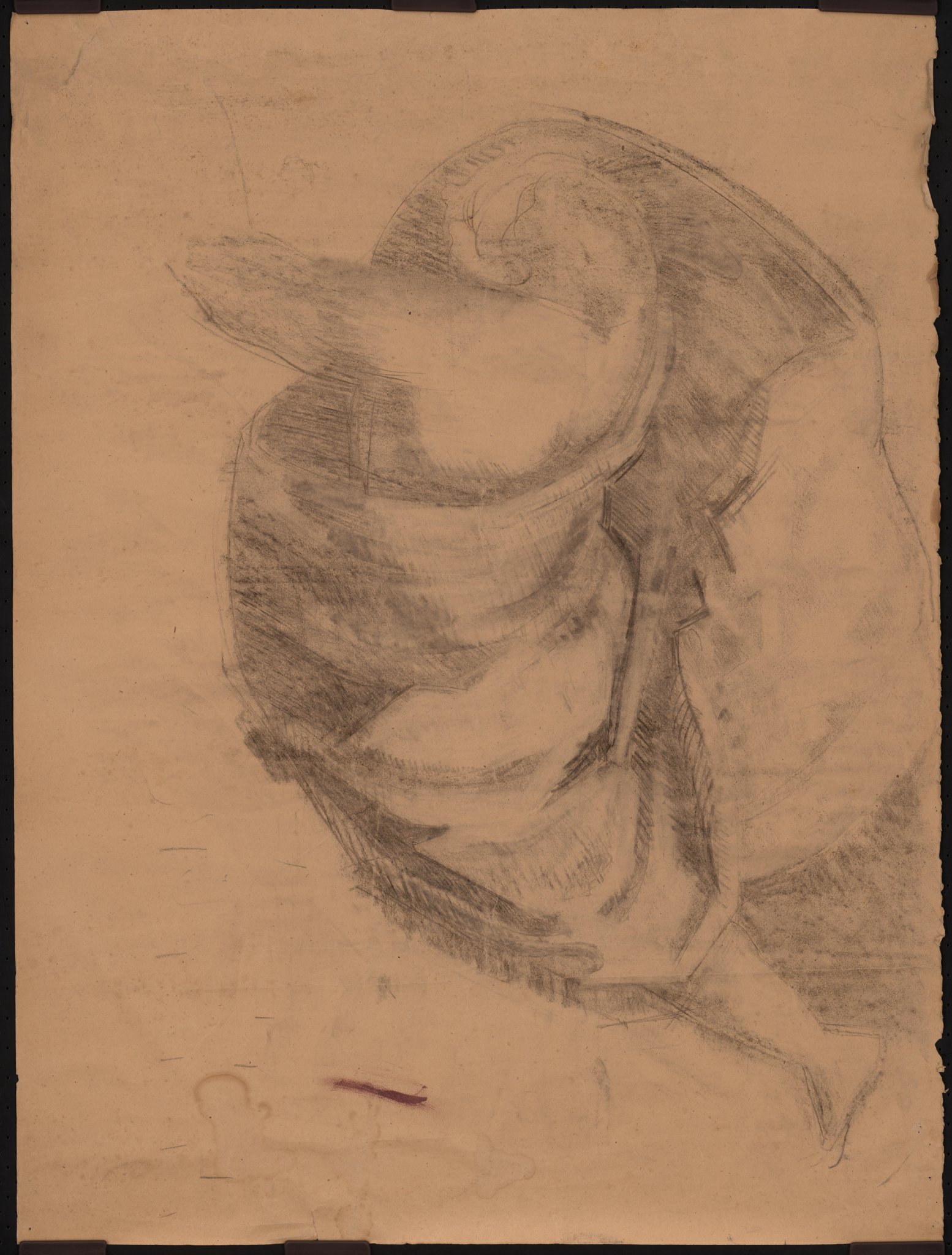 Il s'agit d'une esquisse pour l'ange, symbole de l'Evangéliste Matthieu, dont le corps traverse le haut des deux lancettes de gauche du vitrail. Ce projet indique que Poncet avait d'abord imaginé tourner le corps de l'ange dans l'autre sens.