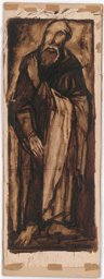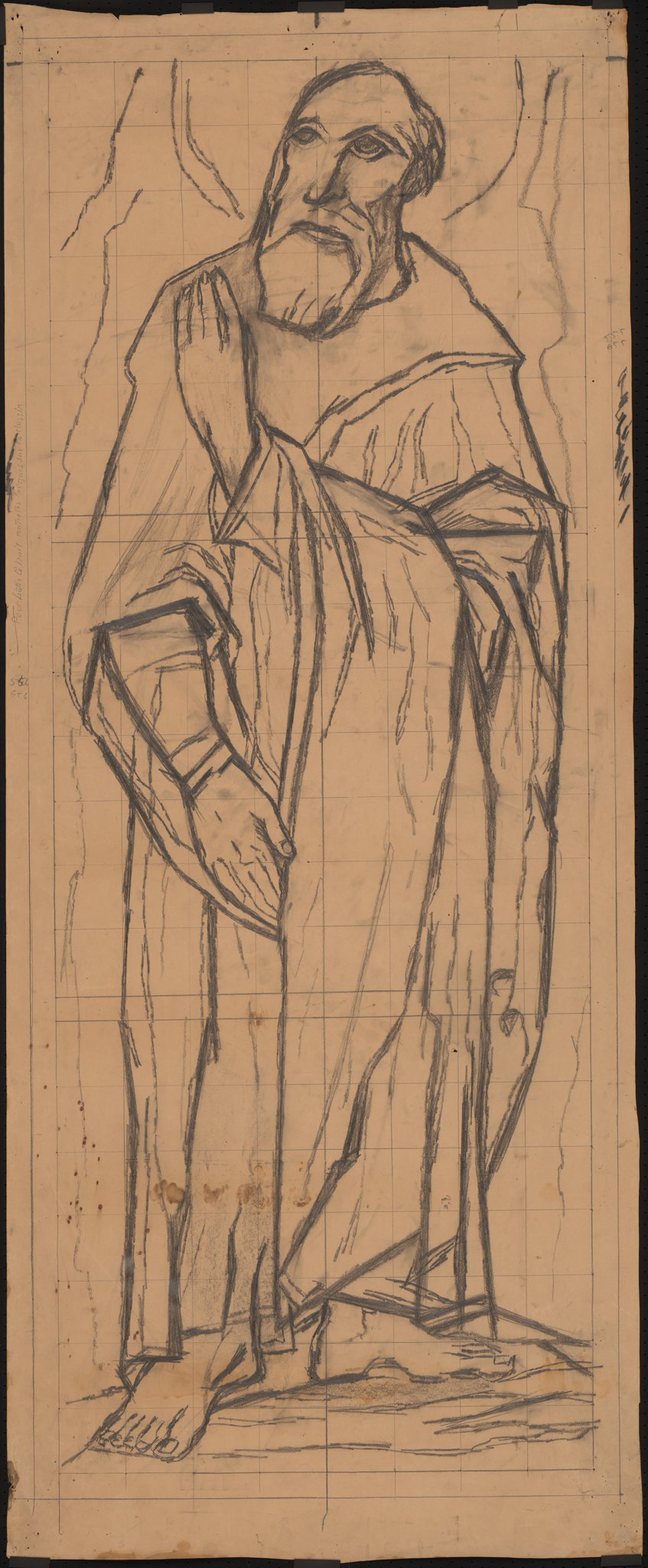 Ce travail préparatoire a été réalisé dans le cadre d'une commande de vitraux pour l'église Saint-Sigismond de Saint-Maurice en Valais. L'église ayant besoin d'être restaurée, le chanoine Louis Poncet propose à son frère de se charger de la réalisation de nouveaux vitraux, afin de remplacer les anciennes verrières du XIXème. La Paroisse disposant de peu de moyens, Marcel Poncet obtient un subside de la fondation Gleyre pour la réalisation de huit vitraux sur le thème des Prophètes. Les quatre premiers vitraux sont posés au cours de l'année 1944, et reçoivent des échos très positifs dans la presse. Les quatre derniers sont réalisés au cours de l'année 1946, et inaugurés en juin 1947. En 1960, les vitraux, alors jugés trop sombres pour la nef, ont été déplacés dans le choeur, superposés les uns au-dessus des autres. Ceux-ci n'ont retrouvé leur emplacement d'origine qu'en 2001, grâce à l'entremise de Jean-Pierre Coutaz, auteur des vitraux actuels du choeur. Ces oeuvres, qui jouent à la fois sur d'audacieux jeux de couleur et une grisaille abondante, semblent condenser les expériences antérieures de Marcel Poncet dans un nouvel équilibre entre ses métiers de peintre et de verrier. Les vitraux de Saint-Sigismond figurent, avec ceux de Saint-Paul de Grange-Canal et les quatre Evangélistes de la cathédrale de Lausanne, parmi ses réalisations les plus célèbres (NOVERRAZ, 2014, pp. 80-88 ; REYMOND, 1992, pp. 79, 108-112, 173-175 ; Dossier "Vitraux, Eglise Saint-Sigismond, Saint-Maurice, 1941-1947", boîte "VITRAUX II, 1932-1947", fonds Poncet, Vitrocentre Romont).