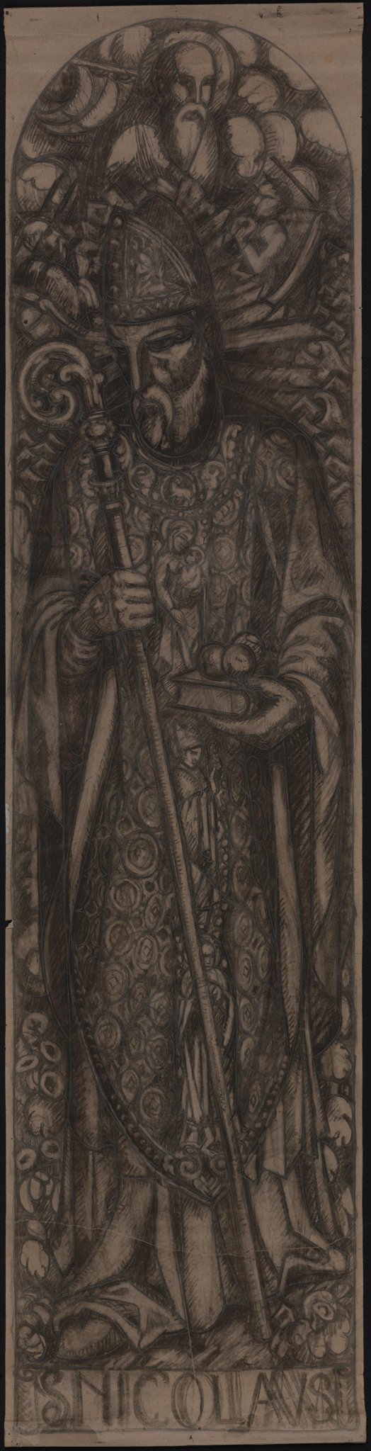 Poncet réalise deux maquettes pour le vitrail de saint Nicolas (MP_03.05 et MP_03.09) qui traduisent deux conceptions très différentes. Dans la première, MP_03.05 le saint occupe moins de place et l'aspect décoratif est très présent. La composition est également plus narrative et didactique, avec les trois petits enfants dans le saloir et le saint apparaissant une seconde fois dans la partie supérieure pour calmer la tempête. Poncet semble ensuite se tourner vers une composition moins narrative, où l'expressivité et le caractère du saint sont renforcés, tandis que le seul élément didactique, le saint calmant la tempête, est relégué au sommet du vitrail. C'est cette formule qui sera conservée dans les cartons définitifs (MP_03.12 et MP_03.18).
