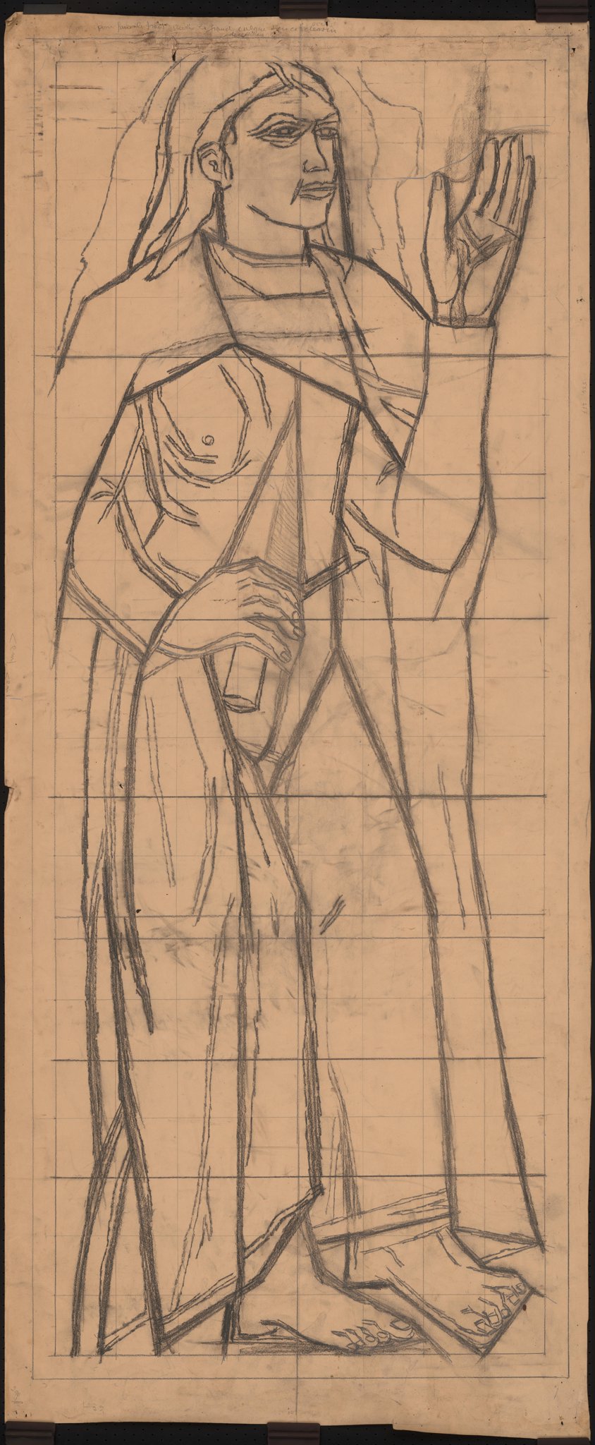 Ce travail préparatoire a été réalisé dans le cadre d'une commande de vitraux pour l'église Saint-Sigismond de Saint-Maurice en Valais. L'église ayant besoin d'être restaurée, le chanoine Louis Poncet propose à son frère de se charger de la réalisation de nouveaux vitraux, afin de remplacer les anciennes verrières du XIXème. La Paroisse disposant de peu de moyens, Marcel Poncet obtient un subside de la fondation Gleyre pour la réalisation de huit vitraux sur le thème des Prophètes. Les quatre premiers vitraux sont posés au cours de l'année 1944, et reçoivent des échos très positifs dans la presse. Les quatre derniers sont réalisés au cours de l'année 1946, et inaugurés en juin 1947. En 1960, les vitraux, alors jugés trop sombres pour la nef, ont été déplacés dans le choeur, superposés les uns au-dessus des autres. Ceux-ci n'ont retrouvé leur emplacement d'origine qu'en 2001, grâce à l'entremise de Jean-Pierre Coutaz, auteur des vitraux actuels du choeur. Ces oeuvres, qui jouent à la fois sur d'audacieux jeux de couleur et une grisaille abondante, semblent condenser les expériences antérieures de Marcel Poncet dans un nouvel équilibre entre ses métiers de peintre et de verrier. Les vitraux de Saint-Sigismond figurent, avec ceux de Saint-Paul de Grange-Canal et les quatre Evangélistes de la cathédrale de Lausanne, parmi ses réalisations les plus célèbres (NOVERRAZ, 2014, pp. 80-88 ; REYMOND, 1992, pp. 79, 108-112, 173-175 ; Dossier "Vitraux, Eglise Saint-Sigismond, Saint-Maurice, 1941-1947", boîte "VITRAUX II, 1932-1947", fonds Poncet, Vitrocentre Romont).