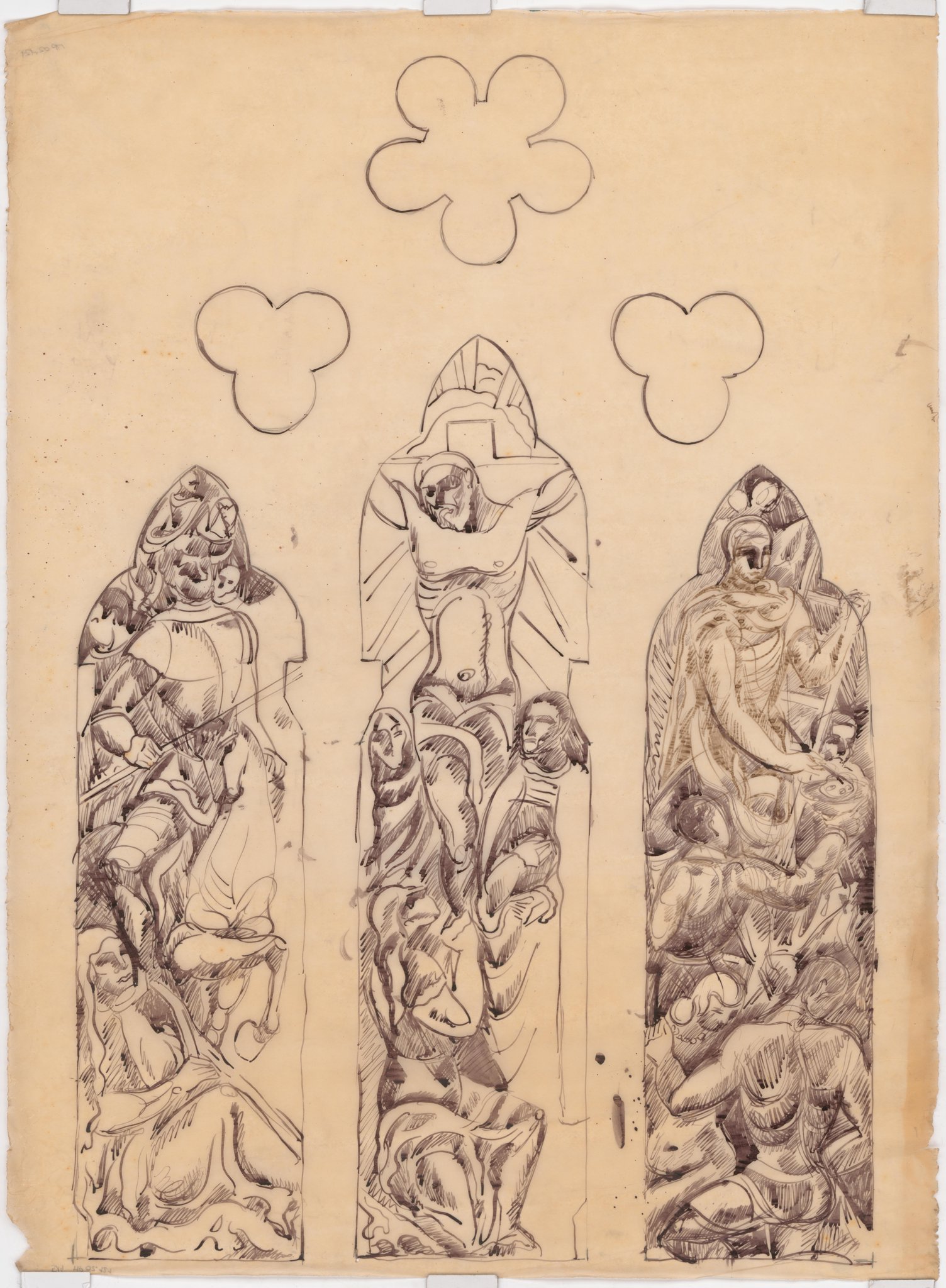 Esquisse pour l'ensemble du vitrail de la Crucifixion : sur la lancette centrale, le Christ en croix, entouré de Marie et Jean, et Marie-Madeleine au pied de la croix. Sur la lancette de gauche : le porte-lance à cheval, habillé en soldat et à ses pieds, une femme assise se tenant la tête dans la main. Sur la lancette de droite, le porte-éponge est représenté au sommet, retenant de sa lance la foule qui se presse autour de lui. Dans le bas de la lancette, un homme et une femme sont assis, celui du premier plan de dos, semblant prostrés. Au sommet de la composition, les deux trilobes et le quintilobe du réseau sont esquissés.