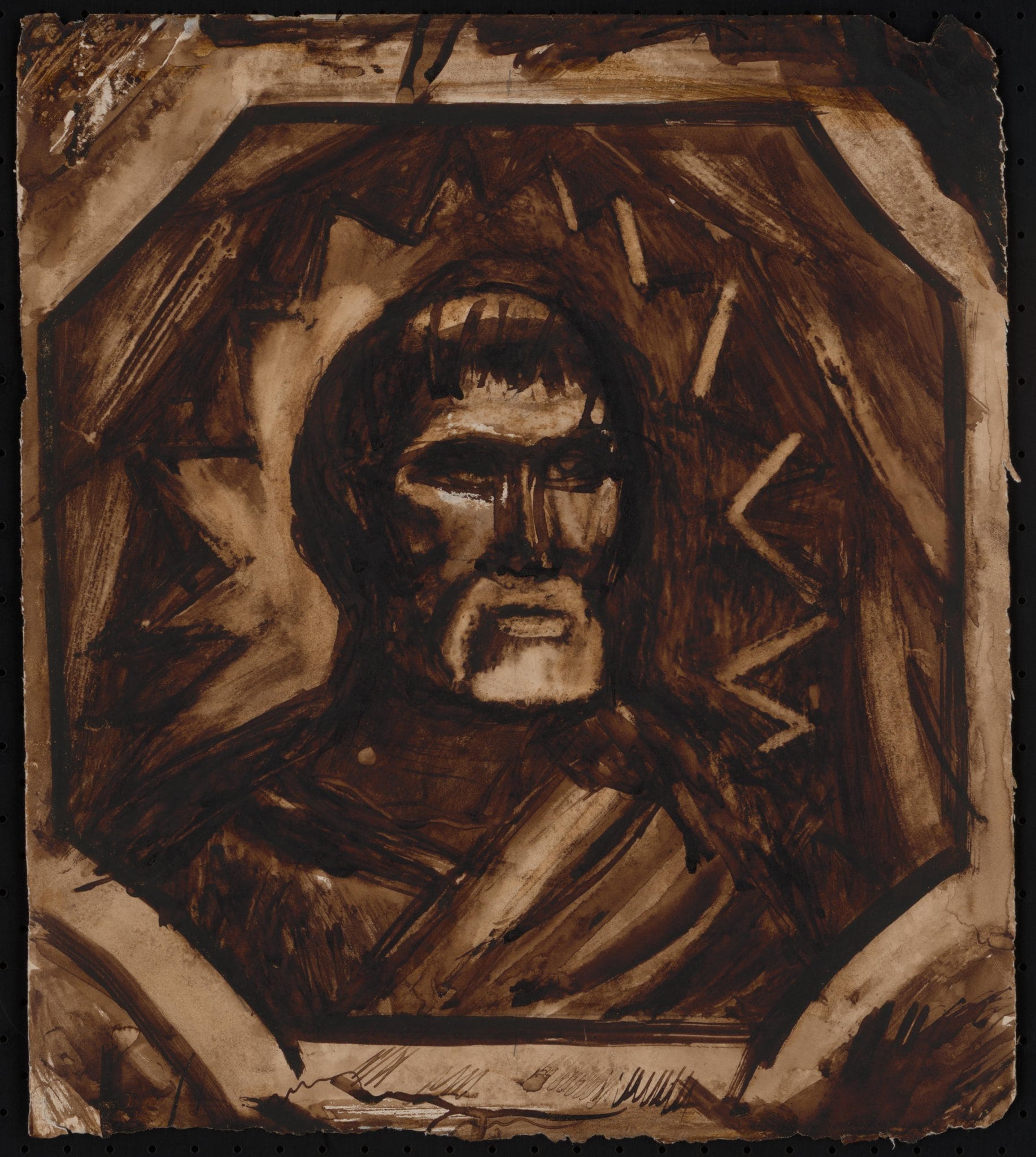 Il s'agit probablement d'un carton pour l'un des quatre petits vitraux du choeur de l'église de Gstaad. Ces fenêtres, divisées en trois parties avec de petites scènes en bas et au centre comprennent un médaillon avec buste de saint à leur sommet.