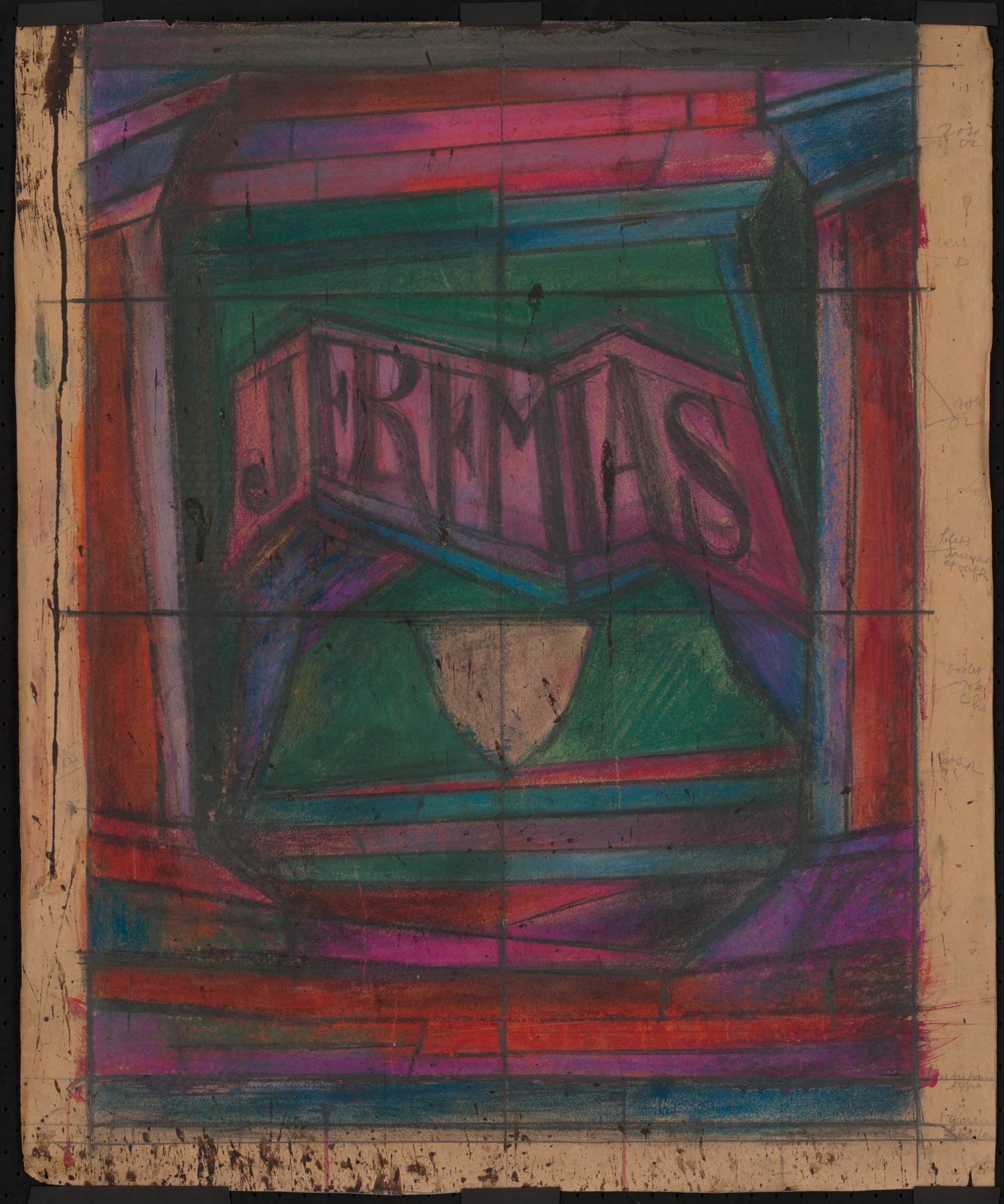 Cartouche avec le nom et l'emplacement pour l'armoirie du vitrail de Jérémie.