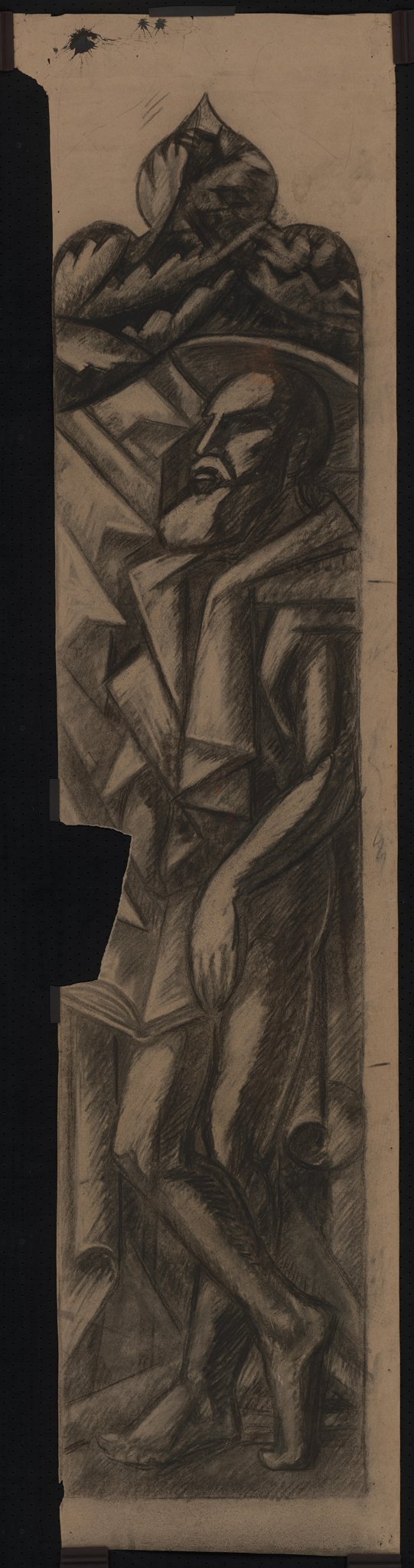 Ce carton en noir et blanc pour la quatrième lancette du vitrail des quatre Evangélistes, correspond à une phase avancée du travail, sa composition étant déjà presque arrêtée, et le style s'apparentant au résultat du vitrail. Poncet modifiera encore la position de saint Luc pour le placer plus de trois-quarts sur le vitrail. Il fait partie d'un ensemble de quatre cartons similaires (MP_02.130, MP_02.131, MP_02.132 et MP_02.133).