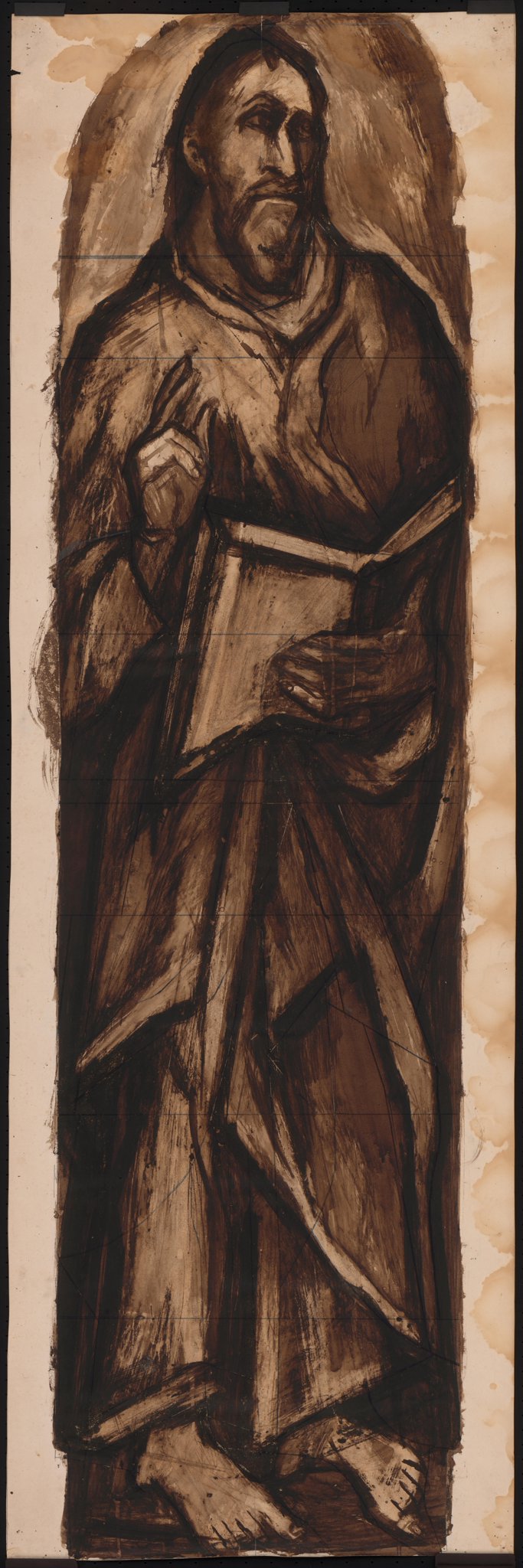 Le prophète Ezéchiel en pied, tenant un livre ouvert devant lui, et levant les deux doigts de l'autre main.
