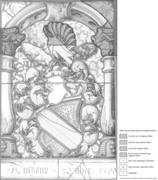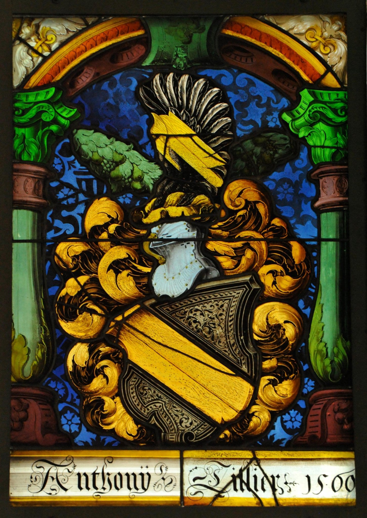Vor blauem Damastgrund erscheint das aufs Podium mit der Stifterinschrift gesetzte Vollwappen Anton Tilliers. Umfasst wird es von einer Renaissance-Architektur aus grünen Balustersäulen mit lila Basen und grünen Kapitellen sowie einem mehrfarbigen Flachbogen, an dem eine Blattgirlande aufgehängt ist.