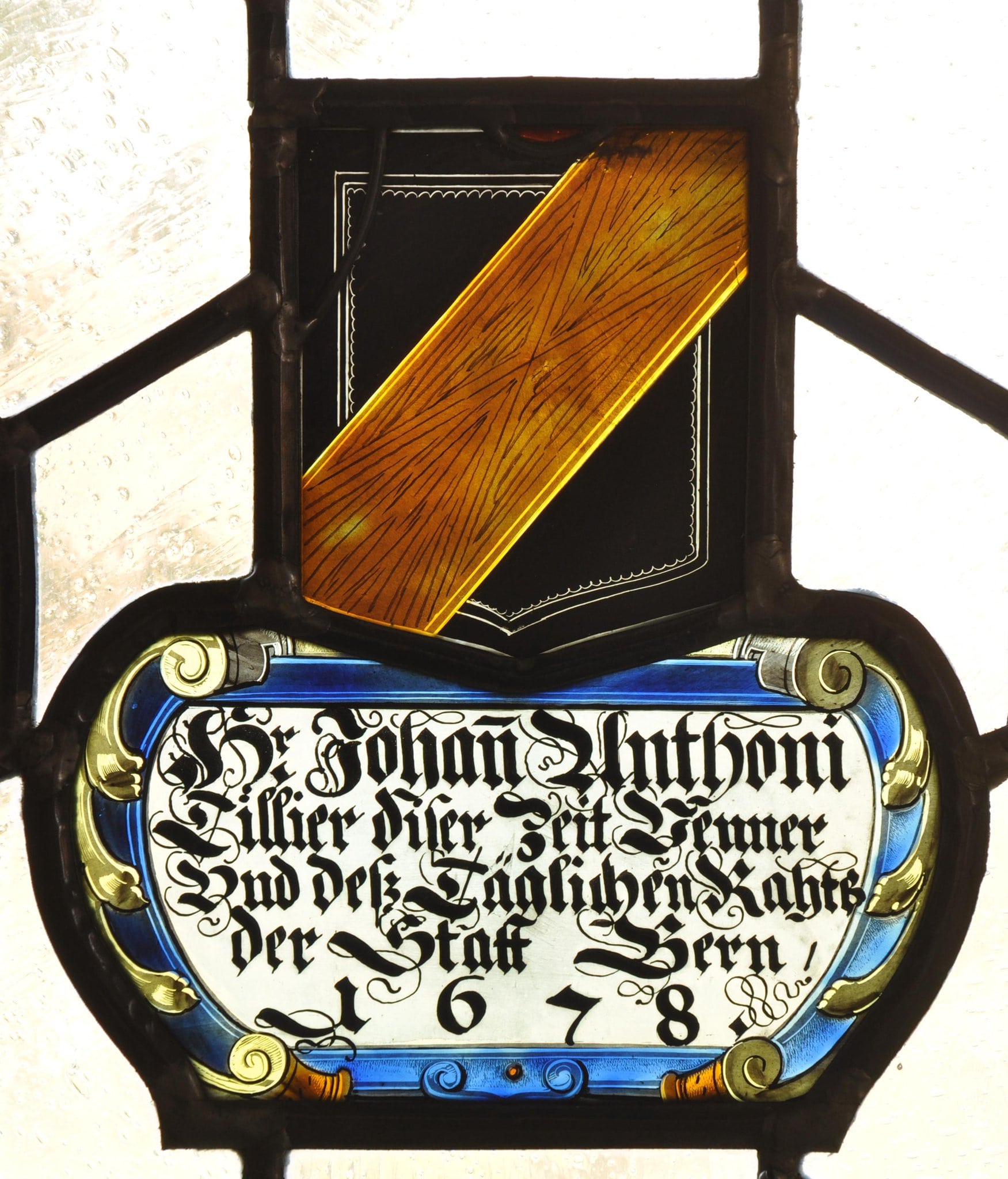 Von dieser Scheibe ist lediglich der Wappenschild Johann Anton Tilliers mit der darunter befindlichen Inschriftkartusche erhalten.
