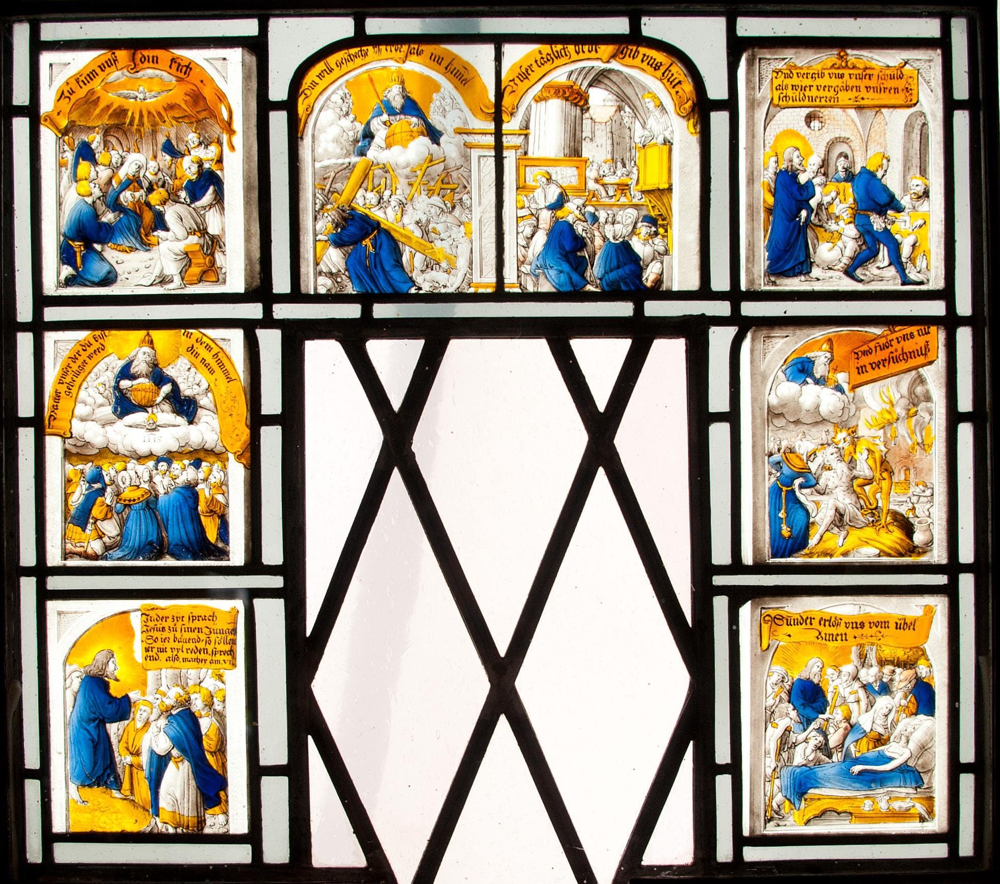 Im ersten Bild des Gebets thront Gottvater mit der Weltkugel in den Händen, von Engeln begleitet, im Wolkenkranz. Unter den Wolken kniet eine Gruppe von Frauen und Männern andächtig im Gebet. Über ihren Köpfen senkt sich die Taube des Heiligen Geistes herab (Mt 6, 9).