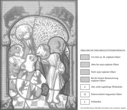 Die ganze Rahmung, der Kopf des Heiligen und einige weitere Gläser neu ergänzt; ein altes Flickstück im Fliesenboden; Sprungbleie; die Verbleiung erneuert.