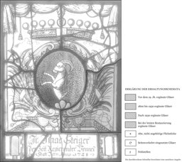Die sechs alten Glasgemälde der Kirche Frutigen konnten von der Rückseite nicht genauer untersucht werden (sie sind am steilen Hang hoch oben in den Fenstern eingefügt). Die vorliegende Zustandsanalyse besitzt deshalb keine definitive Gültigkeit.