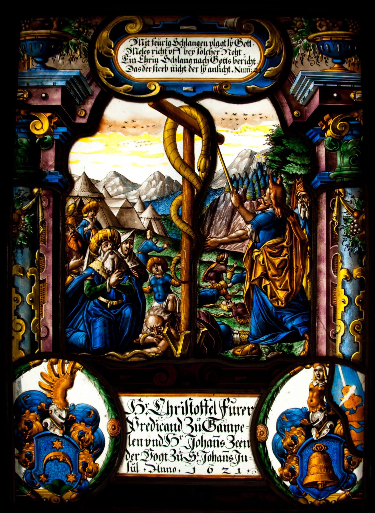 Das Hauptbild zeigt Moses bei der Errichtung der Ehernen Schlange in einer gebirgigen Landschaft (4 Mose 21, 6–9). Umfasst wird die Darstellung von einer violetten Pfeilerarkade mit vorgesetzten blau-gelben Säulen, über deren Kapitellen Fruchtschalen auf Gebälkstücken stehen. Dazwischen ist die Bildlegende in einer blau-gelben Rollwerkkartusche platziert. Am Scheibenfuss wird die innerhalb einer roten Rollwerkkartusche stehende Stifterinschrift von den beiden Vollwappen Christoph Furers und Johannes Zeenders in ovalen Blattkränzen eingefasst.