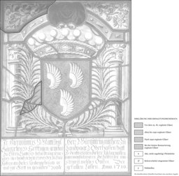 Das Glas in der Ecke oben links und zwei kleine Glasstücke im linken Palmzweig neu ergänzt; Retuschen beim Band unter dem Wappenschild und in der rechten Säule unten; mehrere Sprünge und Sprungbleie; die Verbleiung erneuert.