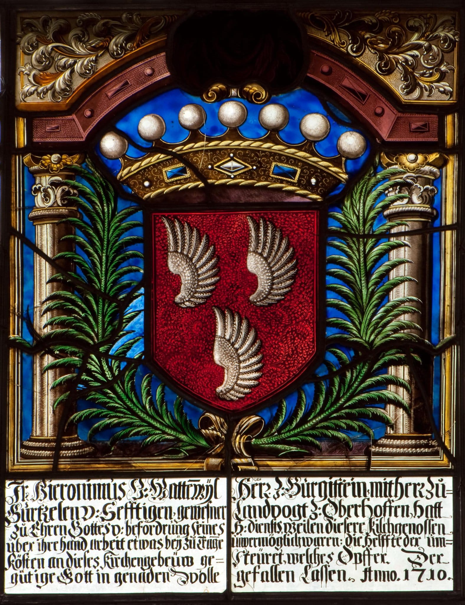 Jr. Hieronimus V: Wattewÿl Herr Z: Burgistein mitherr Zů / Gurtzelen V: Sefftigen gewesner Landvogt Z: Oberhoffen, hatt / zů Ehren Gottes V: befördrung seines H: diensts weilen diesere kilchgenossen / über ihre hand arbeit etwas beÿ zů Trage unvermöglich waren: die helffte der um= / Kösten an dieses Kirchengebeüw ge=steüret, welches Opffer Der / gütige Gott in genaden wolle gefallen Lassen. Anno. 1710.