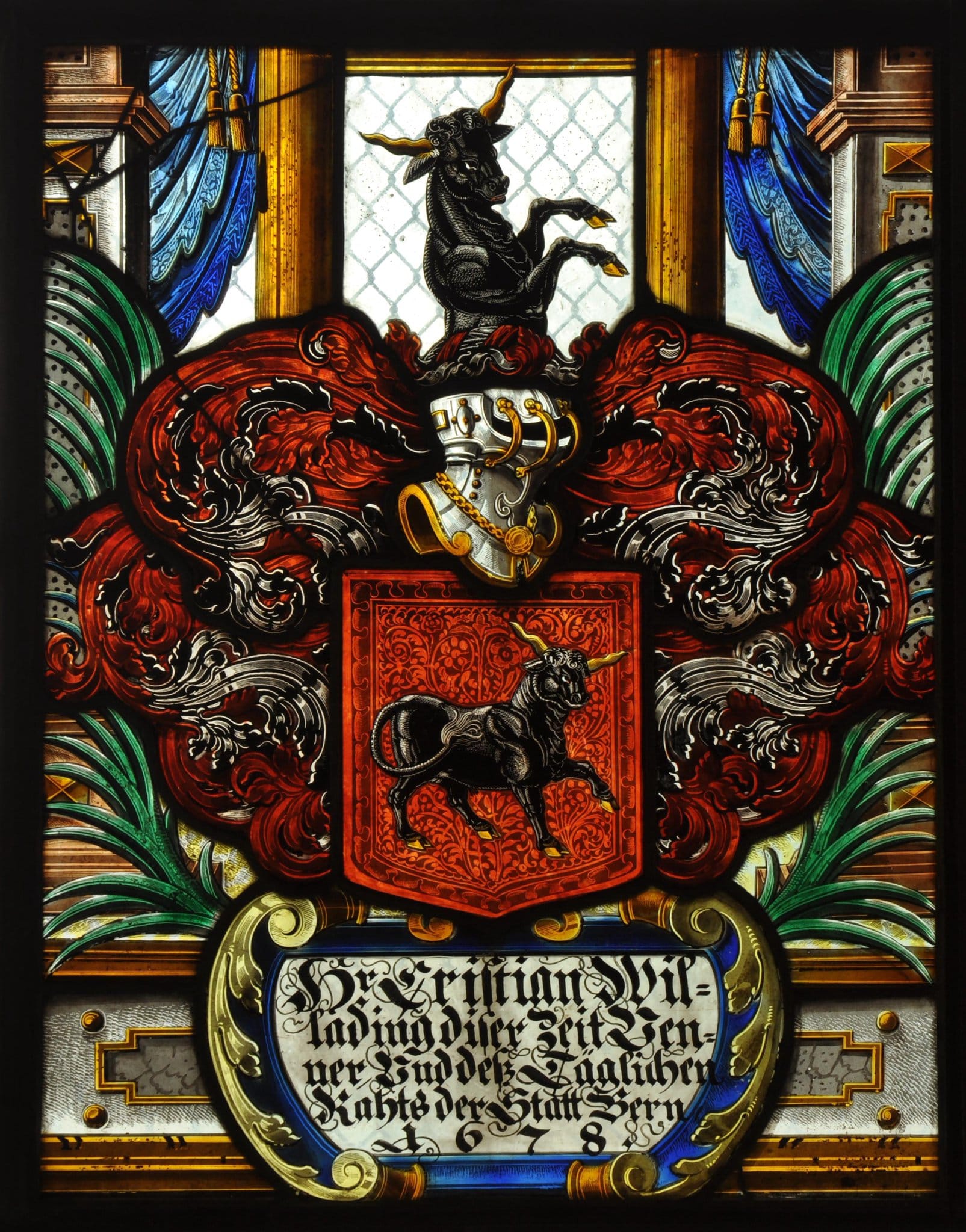 Über der Rollwerkkartusche mit der Stifterinschrift steht das von zwei Palmwedeln umkränzte Vollwappen des Venners Christian Willading. Den Wappenschild seitlich rahmend, erheben sich auf dem Podium zwei Pilaster in den Farbtönen Grau und Braungelb. Hinter dem Wappenschild ragen vor farblosem Grund zwei weitere Stützen in Form dunkelgelber Rundpfeiler in die Höhe. Zwischen ihnen und den Aussenpilastern hängt ein blauer Vorhang mit goldenen Kordeln herab.
