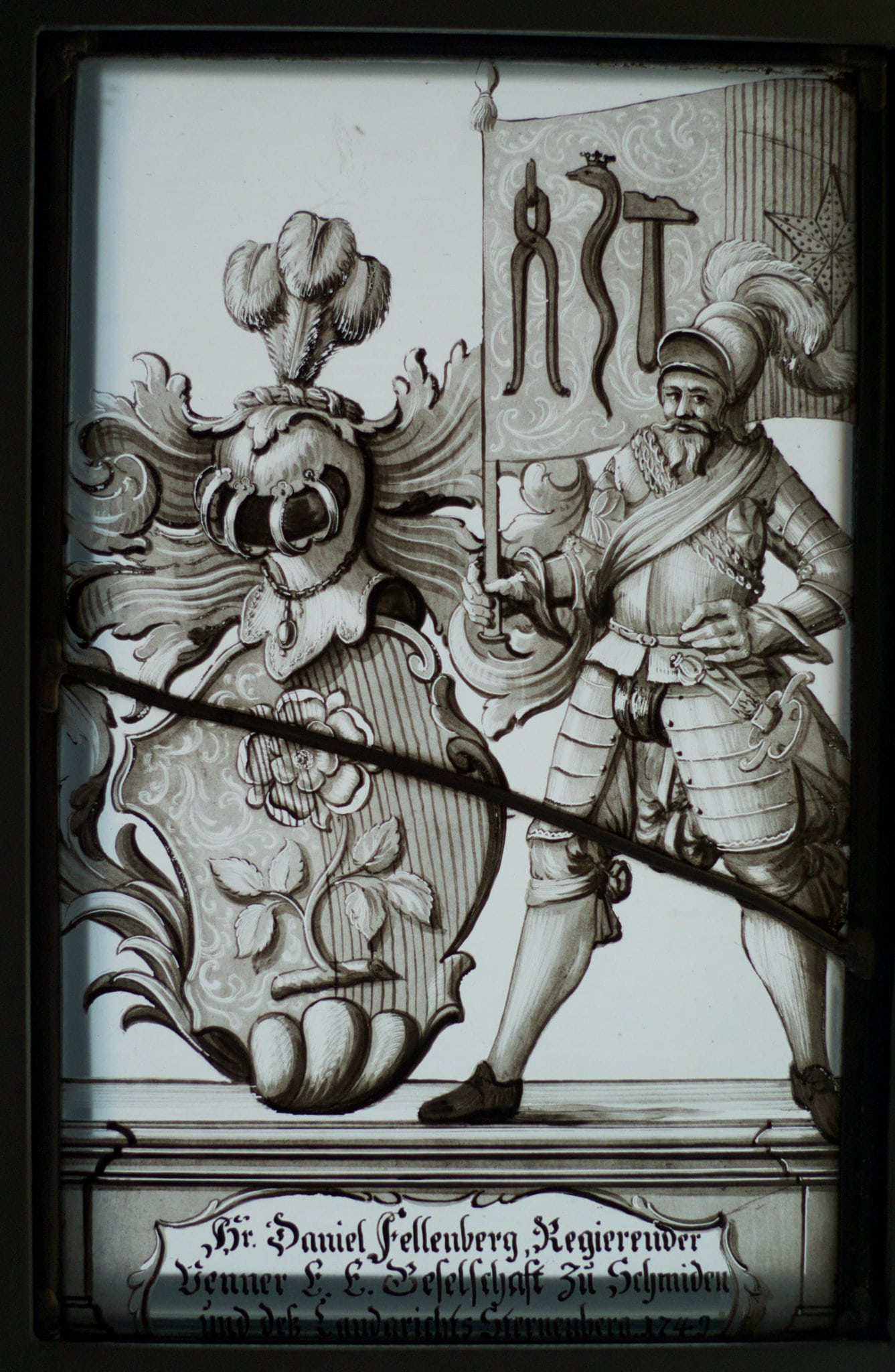 Daniel Fellenberg wurde am 4.6.1678 als Sohn des Daniel und der Johanna König in Bern geboren, Er heiratete am 20.4.1691 Anna Maria Bucher, die Tochter Hans Jakob Buchers und Anna Maria Fischers, und brachte mit ihr sechs Kinder zur Taufe. Daniel Fellenberg war Notar, Grossrat, Vogt zu Schenkenberg und Venner zu Schmieden in Bern. Als solcher stiftete er 1747 eine Scheibe in die Kirche Grafenried und eine weitere 1749 in die Berner Schmiedenzunft. Ausführen liess er diese beiden Werke durch Samuel Küpfer. Daniel Fellenberg, dessen Bruder, der Geistliche Burkart (1676–1757), 1699 wegen Pietismus des Landes verwiesen worden war, wurde 1728 von König Friedrich Wilhelm I. von Preussen samt seiner Nachkommenschaft geadelt. Er starb 1758 in einem Alter von knapp 80 Jahren (HLS 4/2005, S. 464; Kessel 2016).