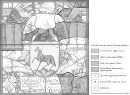 Das Wappen Samuel Frischings über der violetten Rollwerkkartusche mit der Stifterinschrift wird von einem dahinter stehenden Engel in rotem Gewand gehalten. Umrahmt wird dieser von einem hallenförmigen Gebäude aus sechs blauen Säulen und einem sich darüber hinziehenden, perspektivisch verkürzten roten Gebälk, über das sich ein Flachbogen mit blauer Scheitelkartusche spannt. Unter diesem sind auf dem Gebälk zwei Kanonen und nach aussen hin zwei Fruchtbouquets platziert. Die Schriftkartusche unten flankieren zwei Figuren, links ein Krieger im Harnisch mit Schwert und Schild sowie rechts eine Kriegerin mit Lanze und Schild.