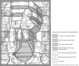 Die Gläser zwischen den Beinen des Bannerträgers neu ergänzt; zahlreiche Sprungbleie; die Verbleiung erneuert.