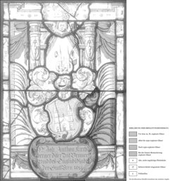 Die ganze Inschriftenkartusche und der untere Teil des rechten Palmzweigs mit einem angrenzenden kleinen Helmdeckenstück neu ergänzt (das Foto des SNM Zürich zeigt an Stelle des ergänzten Inschriften- und Palmzweigstücks je eine Lücke); Sprungbleie; die Verbleiung erneuert. Laubschers architektonische Einfassung scheint hier mit Ausnahme des unteren Teils auf der linken Seite mehr oder weniger unversehrt erhalten zu sein (im Erhaltungsschema sind die betreffenden Stücke nicht erfasst).