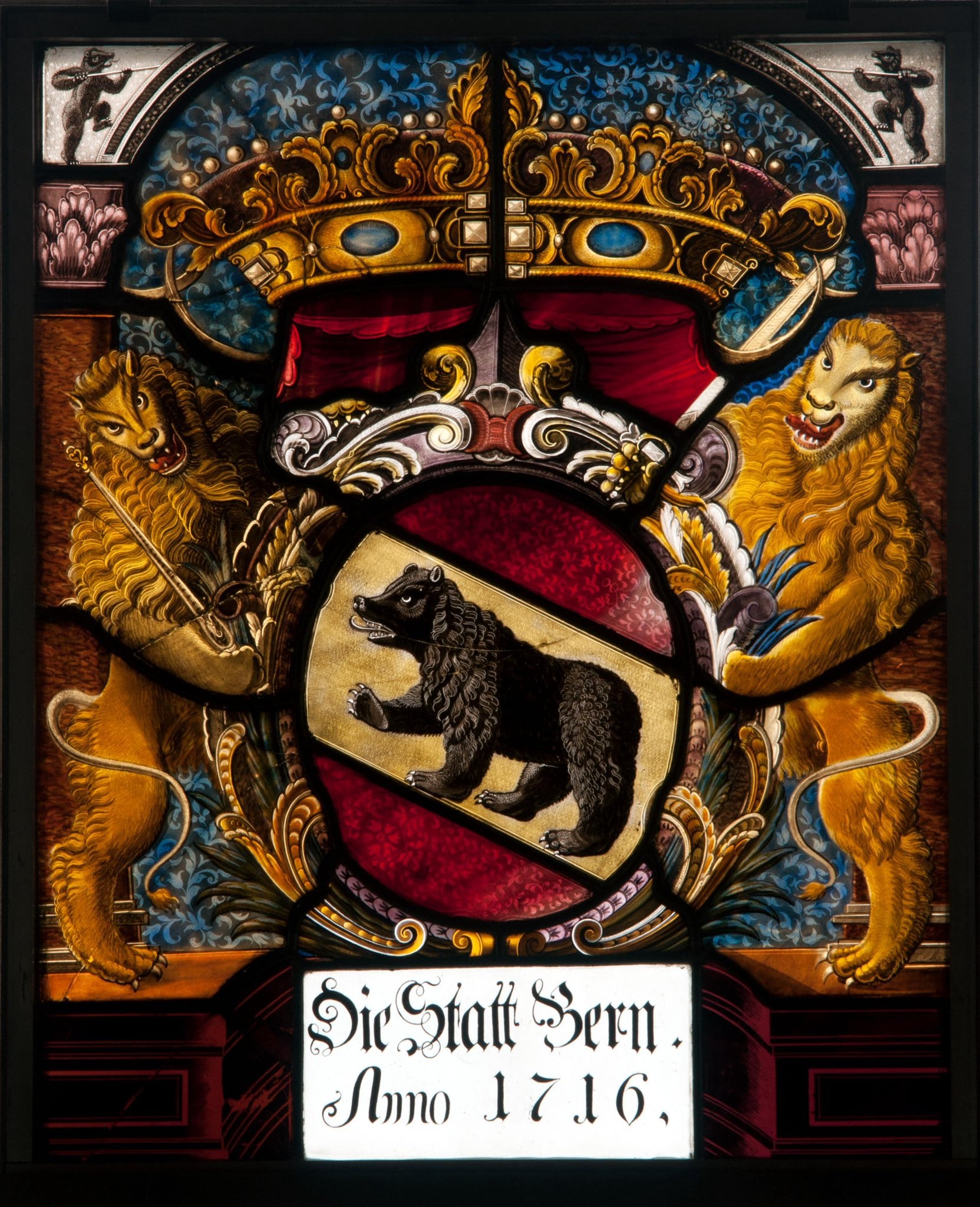 In einer ovalen Rocaille-Kartusche wird das Wappen Berns vor blauem Damastgrund von einer mit einem roten Vorhang behängten Krone überhöht. Den Wappenschild halten zwei Löwen mit Zepter bzw. Schwert. Sie stehen auf mächtigen roten Podesten, zwischen denen sich die Tafel mit der Stifterinschrift befindet. Hinter den Löwen erheben sich zwei einen Flachbogen tragende bräunlichrote Pfeiler. Auf den Säulenkapitellen duellieren sich zwei Bären mit Spiessen.