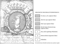 Ein Stück in der Wappenkartusche unten links neu ergänzt (das Foto des SNM Zürich zeigt stattdessen ein Flickstück sowie weniger Sprungbleie als heute); ein kleines altes Flickstück; Sprungbleie; die Verbleiung erneuert.