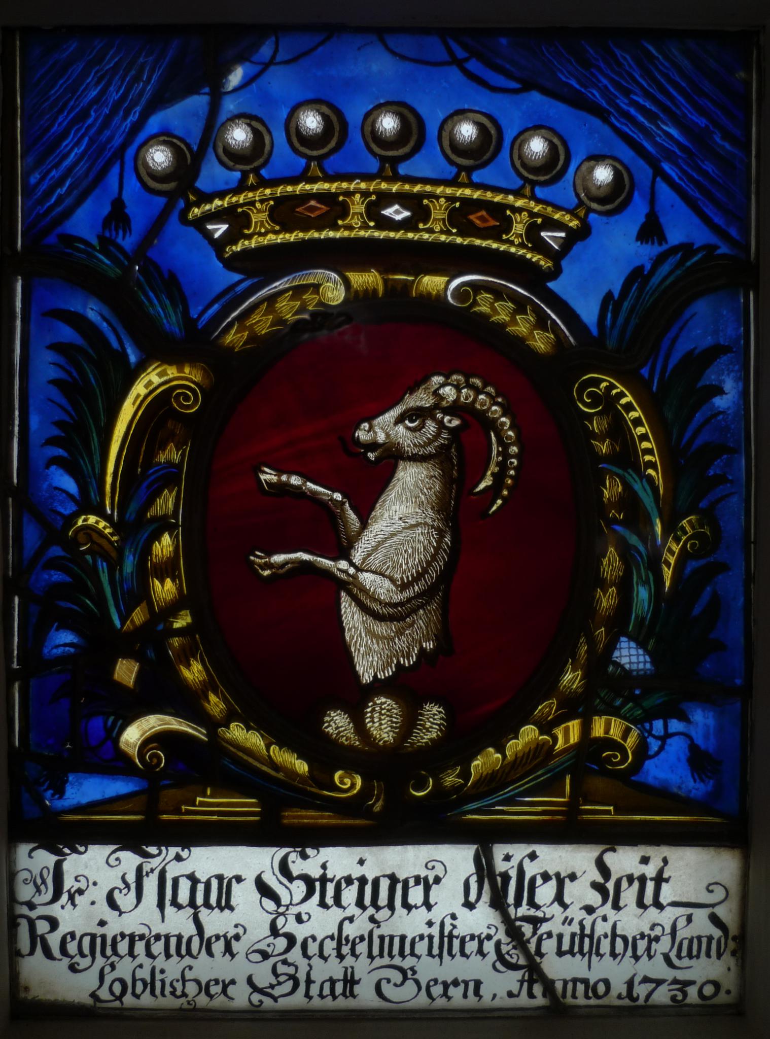 Wappenscheiben Isaak Steigers haben sich auch in den Kirchen von Frutigen (1728)Herzogenbuchsee (1728) und Hilterfingen/Oberhofen (1728) aus der gleichen Glasmalerwerkstatt erhalten.