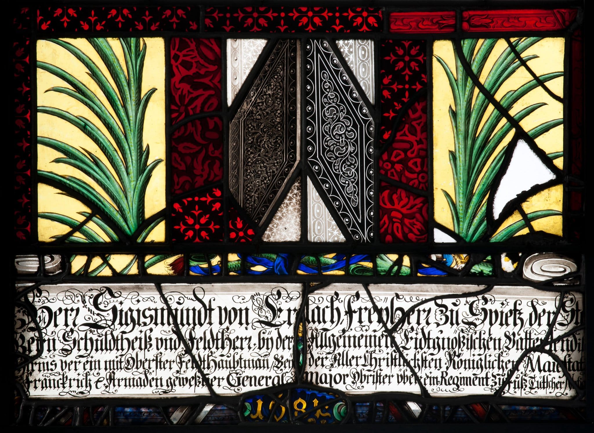 Die Scheibe vereint Fragmente einer Wappenstiftung des Sigmund von Erlach. Darin enthaltene originale Stücke sind vermutlich die Inschrift sowie Teile des Wappens und des Palmwedelkranzes. Eine ungefähre Vorstellung vom ursprünglichen Aussehen der Scheibe gibt das 1681 von Sigmund von Erlach in die Kirche Steffisburg gestiftete Glasgemälde.