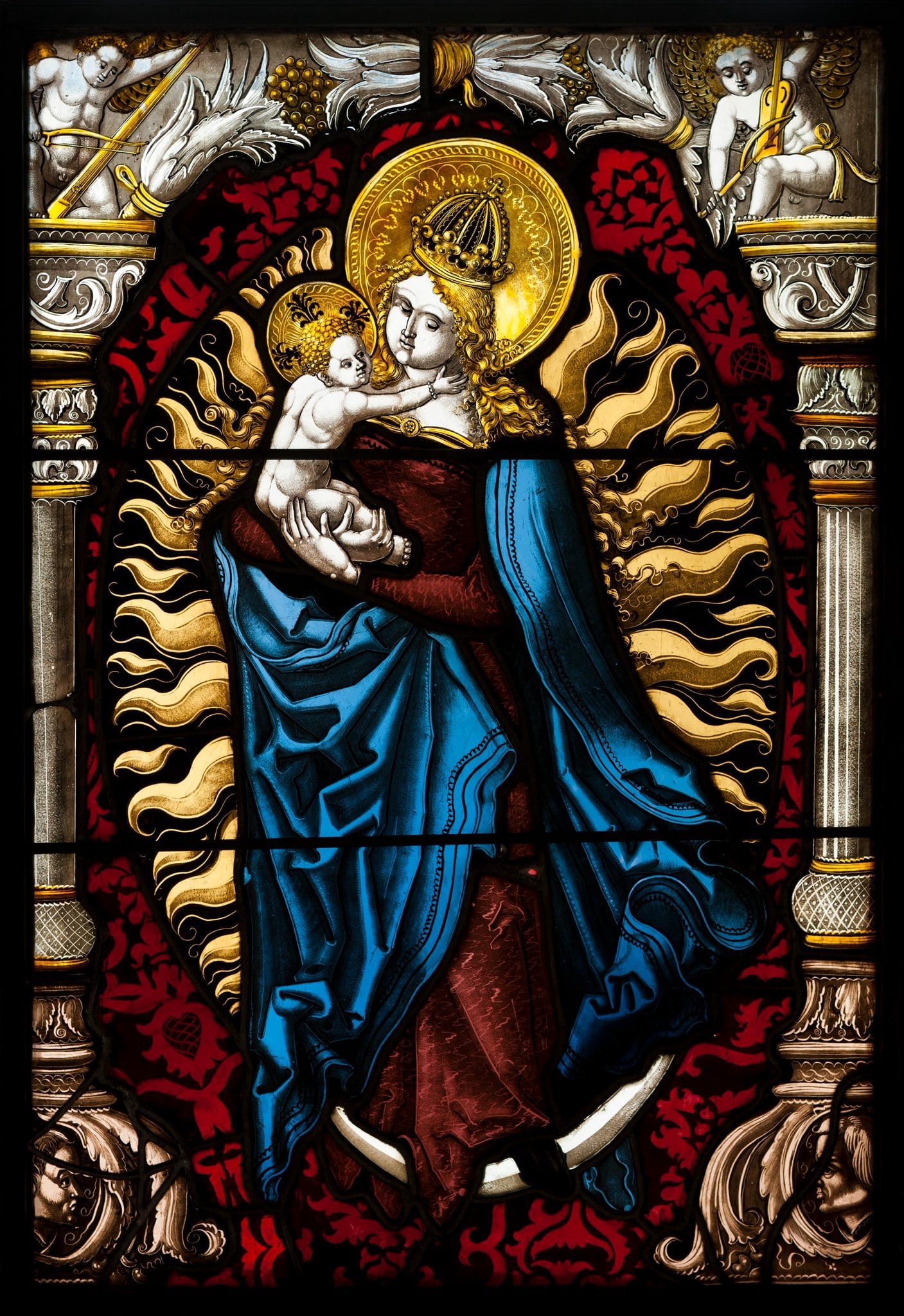 Das Eckstück unten rechts sowie der linke Teil der Mondsichel mit dem darunter liegenden Kleidungsstück neu ergänzt; ein winziges altes Flickstück im Madonnenkleid; ein Sprung und einige Sprungbleie; die Verbleiung erneuert.