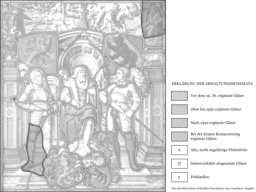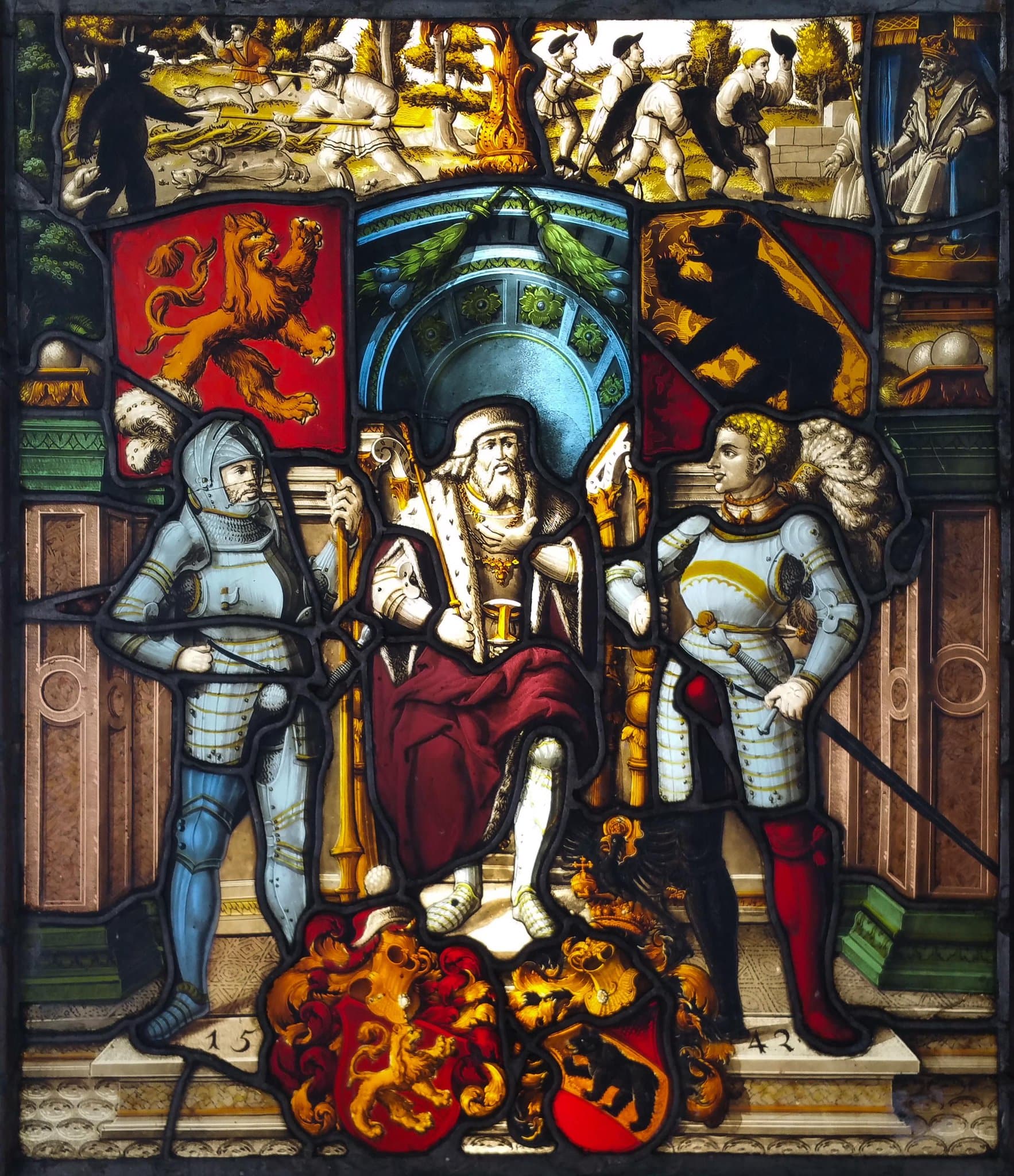 Die Scheibe zeigt den Stadtgründer Herzog Berchtold V. von Zähringen thronend in einer zentralperspektivisch angelegten blauen Nischenarchitektur. Neben ihm sind der Zähringer und Berner Venner postiert. Die beiden in einen hellblauen Voll- beziehungsweise Halbharnisch gekleideten Begleitfiguren stehen mit den Bannern Zähringens und Berns in ihren Händen auf dem Thronpodium. Davor sind zu Füssen des Herzogs die Wappenschilde von Zähringen und Bern sowie über dem letzteren der Reichsadler mit dem Reichsapfel in den Krallen festgehalten. Die Figurengruppe wird seitlich von marmorierten rosa Pfeilern gerahmt. Das Oberbild schildert in zwei Szenen die Gründungssage Berns, die zum Namen der Stadt geführt haben soll. Während in derjenigen links die herzoglichen Jäger den Bären erlegen, werden diese in der Szene rechts mit ihrer Beute vom Stadtgründer empfangen.