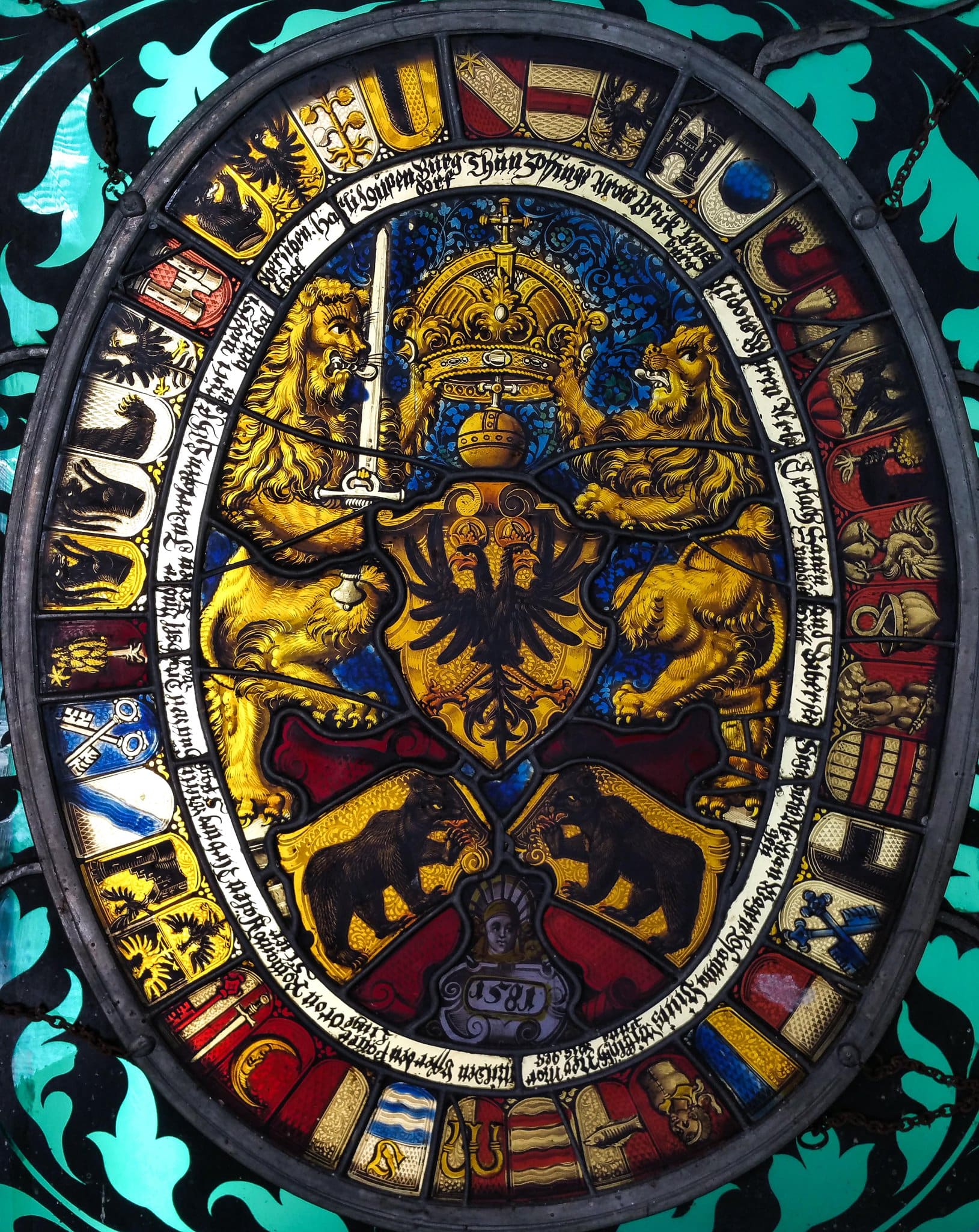 Die vor blauen Damastgrund gesetzte Wappenpyramide Bern-Reich begleiten zwei Löwen, die gemeinsam die Reichskrone über dem auf dem Reichsschild stehenden Reichsapfel emporheben. Der Löwe links hält in seiner rechten Vorderpranke zudem das Reichsschwert. Das Stiftungsjahr ist zwischen beiden Bernschilden in eine violette Rollwerkkartusche mit Maskenschmuck eingeschrieben. Die zentrale Wappen- und Figurenkomposition wird von den folgenden namentlich bezeichneten 39 Berner Ämterwappen umkränzt (oben beginnend im Uhrzeigersinn): Thun, Zofingen, Aarau, Brugg, Lenzburg, Nidau, Büren, Aarberg, Erlach, Saanen, Landshut, Biberstein,Signau, Aarwangen, Wangen, Lausanne, Vevey, Avenches (Wiflisburg), Nyon, Morges, Moudon, Yverdon, Payerne, Oron, Romainmôtier, Aigle, Aarburg, Wiedlisbach, Huttwil, Trachselwald, Interlaken, Unterseen, Aeschi, Frutigen, Niedersimmental, Obersimmental, Hasli, Laupen und Burgdorf.