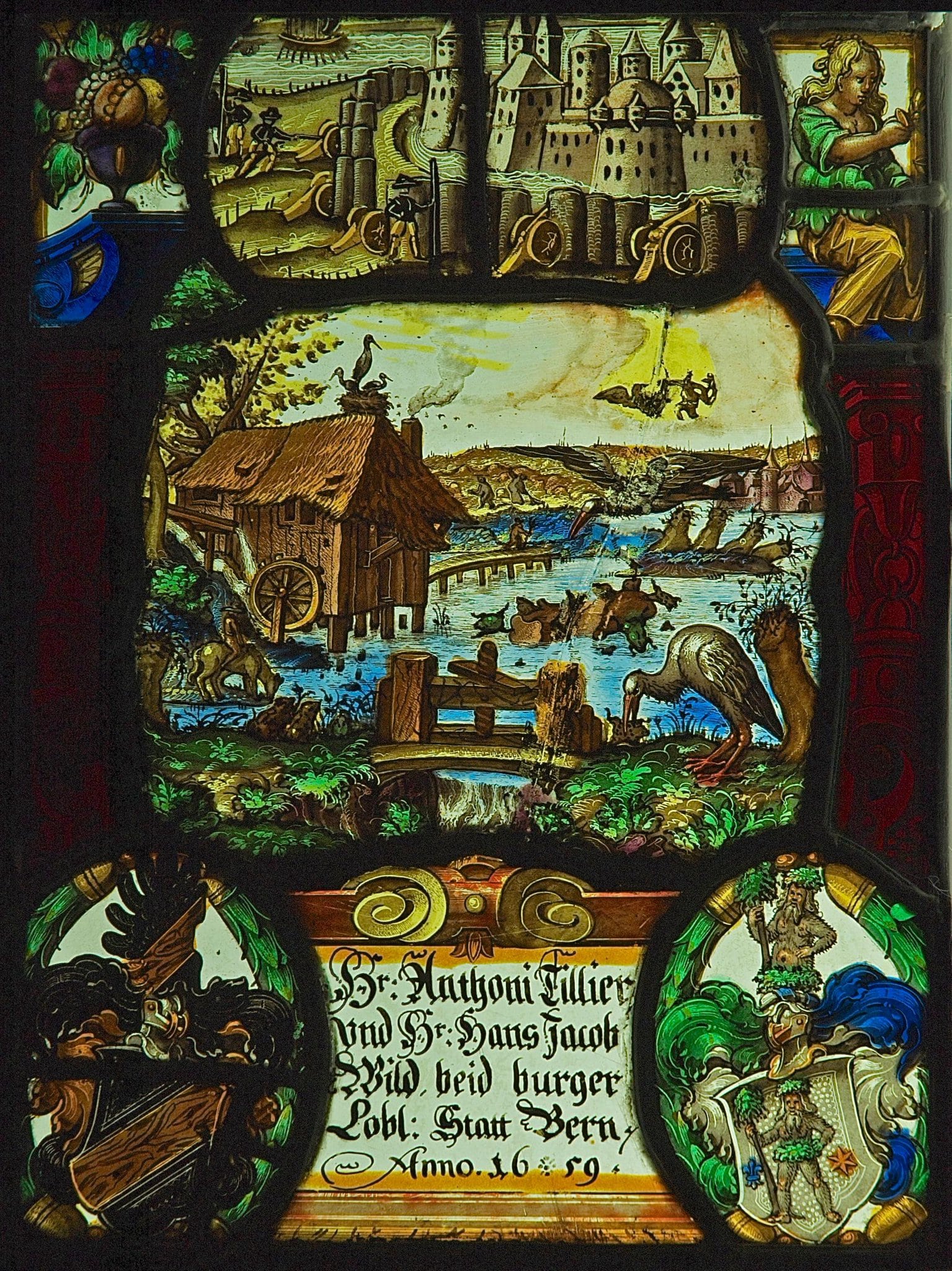Die Scheibe befand sich bis 2000 in der Glasgemälde-Sammlung des Marquis von Bailleul im Schloss Bailleul (Normandie), und zwar zusammen mit einem 1659 von den Bernern Abraham Andres und Albrecht Wyttenbach gestifteten Glasgemälde, das eine weitere Fabel aus den 1622 bei Johann Rudolf Wolf in Zürich herausgegebenen Emblemradierungen Christoph Murers festhält. Diese beiden Glasgemälde stammen vermutlich aus einer Murers Emblemen gewidmeten Scheibenserie von 1659, deren Bestimmungsort leider nicht bekannt ist. Murers Zeichnung zur Fabel mit den Fröschen (Emblem XI) ist im Kupferstichkabinett der Öffentlichen Kunstsammlung Basel erhalten (Inv. Nr. 1887.6a–f; 9,4 x 12,3 cm; Vignau-Wilberg, 1982, Abb. 36). Das die "Falsche Freundschaft" thematisierende Glasgemälde von Abraham Andres und Albrecht Wyttenbach zeigt in den oberen Bildecken je einen auf blauem Gebälk sitzenden, nach aussen gewendeten Putto mit Hahn beziehungsweise Sanduhr. Die Annahme liegt deshalb nahe, dass die allegorische Sitzfigur oben rechts auf der Scheibe Anton Tilliers und Hans Jakob Wilds zum originalen Glasbestand gehört.