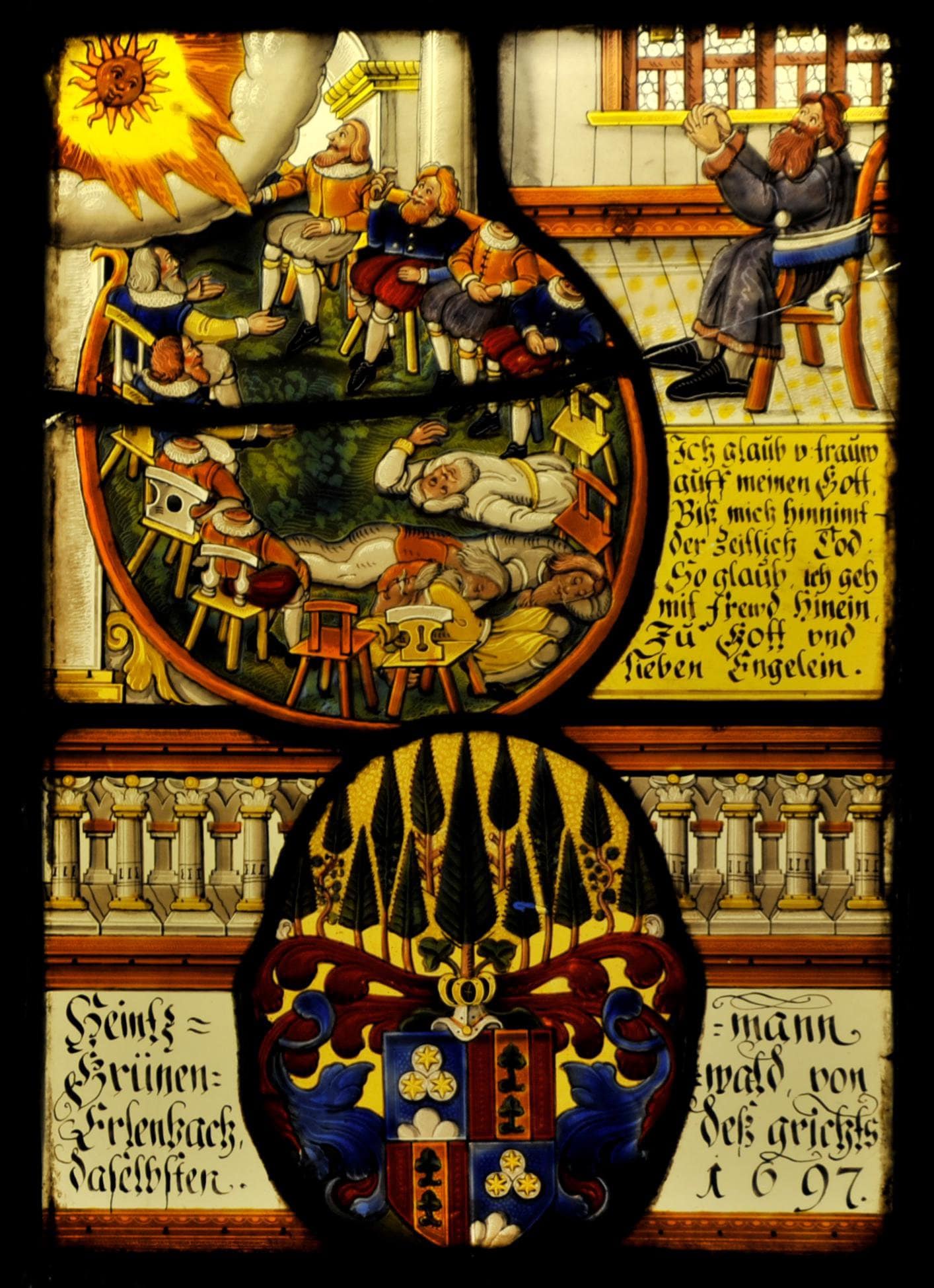 Der oval umbleite Wappenschild von Heinzmann Grünenwald ist in der unteren Scheibenhälfte zentral vor den mit dem Stifternamen versehenen Balustradenaufbau gesetzt. Er besitzt eine blau-rote Helmdecke und einen silbernen Spangenhelm, dessen Kleinod sich hier in unüblicher Weise in Form eines "Grünenwalds" über die ganze Helmdecke ausbreitet. Ebenso ungewöhnlich ist die assymetrische Anordnung des Figurenbildes in der oberen Scheibenhälfte. Es zeigt in der Ecke oben rechts einen auf einem Stuhl sitzenden, alten bärtigen Mann in einer Stube, deren Rückwand vier Butzenfenster mit Wappenscheiben schmücken. Mit erhobenen Händen blickt er in Richtung des göttlichen Lichtes, das in Form einer strahlenden Sonne in der gegenüberliegenden Ecke erscheint. Bei diesem Mann muss es sich um den Stifter handeln, der laut der unter ihm angebrachten Bildlegende in Gott vertrauend den Tod erwartet. Einer sicheren Deutung entzieht sich bislang die direkt unter dem göttlichen Licht im grünen Rasenfeld versammelte Männerrunde. Es sind insgesamt zwölf Männer, die sich im Kreis auf Stühlen niedergelassen haben. Während davon vier angesichts der auf sie einstrahlenden Sonne lebhaft gestikulieren, sind die anderen kopflos beziehungsweise (tot?) am Boden liegend festgehalten. Verkörpern diese Männer möglicherweise die Personen, die Grünenwald als Richter vormals – zum Tode? – verurteilte, und wollte Grünenwald angesichts seines eigenen bevorstehenden Todes sich damit vor Gott als „gerechter“ Richter in Erinnerung rufen?