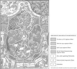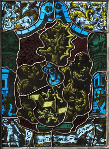 Vor rotem, mattgemustertem Damastgrund nimmt das Vollwappen des Gabriel von Diesbach das Zentrum der Scheibe ein. Es steht auf einer kleinen grünen Konsole, die das Stiftungsjahr enthält. Darunter halten zwei Putten die Schriftrolle mit dem Stifternamen. Den Wappenschild rahmen reich dekorierte grüne und blaue Kandelaber mit einem hellblauen Volutenbogen. Die oberen Zwickelfelder füllt Rankenwerk mit geflügelten Puttenköpfen.