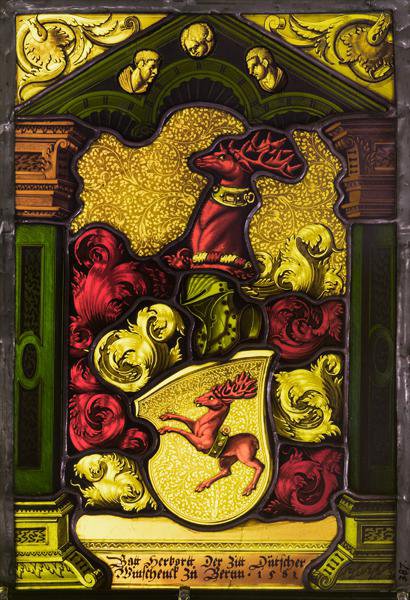 Das vor fein gefiederten gelben Damastgrund gesetzte Vollwappen Beat Herports steht auf dem gelben Podium mit der Stifterinschrift. Es wird seitlich von grünen Pfeilern mit gelben Basen und rosa Kapitellen gerahmt. Darüber erhebt sich ein büstengeschmückter, grüner Spitzgiebel mit eingezogenem Dreipassbogen. Die beiden oberen Zwickelfelder füllt Blattdekor.