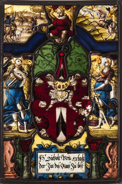 Das Scheibenzentrum nimmt vor grünem Damastgrund das Vollwappen des Diebold von Erlach ein. Es ist unter den eingezogenen blauen Bogen gesetzt, der seitlich auf je zwei Stützen ruht. Vor diesem postiert sind zwei allegorische Frauengestalten, links die Spes mit ihrem Attribut, dem Anker, sowie rechts die Fides mit Kreuz und Hostienkelch in den Händen. Im Oberlicht ist eine Falkenjagd mit Reitern und Hunden festgehalten. Die Jagdszene wird in der Mitte durch den am Bogenscheitel eingefügten sitzenden Putto in roter Kleidung unterbrochen, der in seinen Händen Krone und Palmzweig hält. Der Stiftername befindet sich am Scheibenfuss in einer blauen Rollwerkkartusche.