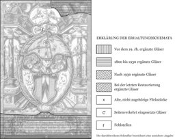 Die Gläser in der Fusszone und das Eckstück oben rechts neu ergänzt; ein kleiner Ausbruch in der Engelskopfkartusche oben; zahlreiche Sprünge und mehrere Sprungbleie; die Verbleiung erneuert.