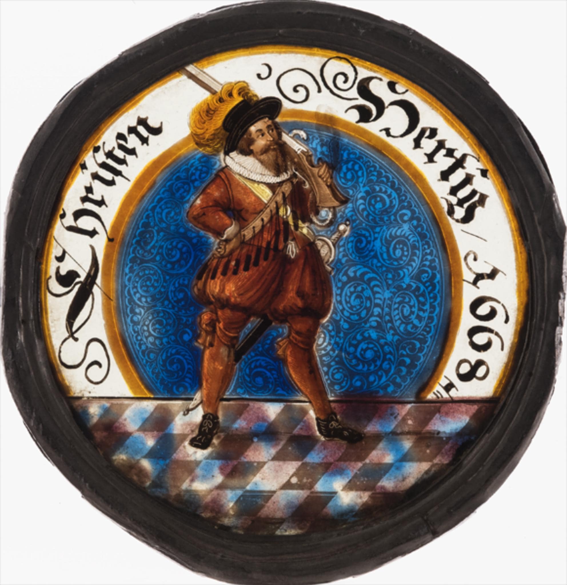 Auf Fliesenboden steht der bärtige Stifter vor blauem, tellerförmig angelegtem Damastgrund. Er erscheint in brauner Kleidung aus Wams, Pluderhosen und Strümpfen sowie mit einem Federhut. Zu seiner Ausstattung gehören die geschulterte Büchse, das um die Brust gebundene Patronenbandelier und das am Gürtel festgemachte Schwert. Um die Figur legt sich kreisförmig die Stifterinschrift.