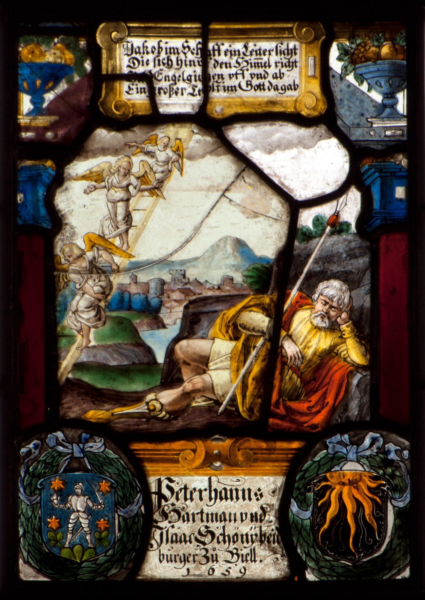 Im Vordergrund einer Fluss- und Berglandschaft liegt der schlafende Jakob bei einem Felsvorsprung. Er hält in der Rechten eine Lanze und stützt mit seiner angewinkelten Linken seinen Kopf. Links neben ihm erscheint die Himmelsleiter mit den Engeln (Gn 28, 11–15). Die Stifternamen sind zwischen den beiden oval umkränzten Stifterwappen an die Front des Podiums gesetzt. Das Hauptbild rahmen seitlich rote Pfeiler mit blauen Kapitellen, auf denen Fruchtschalen stehen. Zwischen diesen befindet sich in einer gelben Rollwerkkartusche die Bildlegende in Versform.