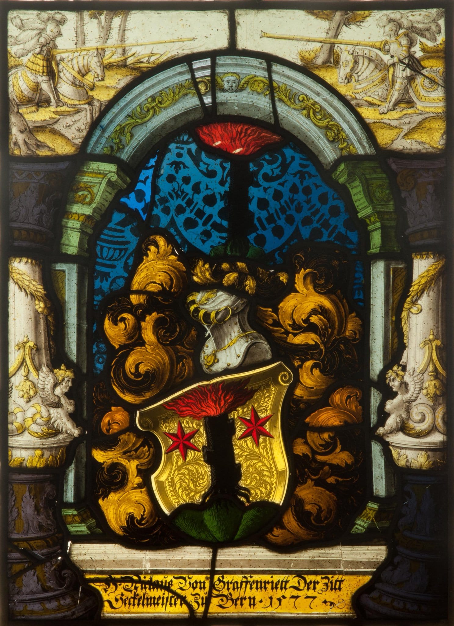 Stilistisch steht das Werk den gesicherten und zugeschriebenen Werken des Glasmalers Abraham Bickhart recht nahe, ohne jedoch deren Qualität zu erreichen. Der Damasthintergrund wird schon in den 1560er Jahren in einer Reihe von Glasgemälden verwendet, die Scheidegger dem Glasmaler Joseph Gösler zuschrieb (Scheidegger 1947, Abb. 35, 36, 42). Auch auf signierten Werken Abraham Bickharts (Scheidegger 1947, Abb. 87, 90) lässt sich dieser Damastgrund nachweisen, der in den 1580er und 1590er Jahren nur noch äusserst selten Verwendung fand. Ob dies ein Hinweis darauf sein könnte, dass der unbekannte Glasmaler in der Werkstatt Bickharts ausgebildet wurde, sei dahingestellt. Es ist offensichtlich, dass die vielen Verwandtschaften in den Glasgemälden der 1570er und 1580er Jahre auf einen gewissen Zeitstil bzw. eine Zusammenarbeit und einen künstlerischen Austausch der Glasmaler hindeuten. Zumindest scheint die ein Jahr ältere Scheibe Niklaus von Graffenrieds in Burgistein einer anderen Hand zu entstammen.