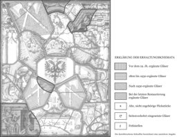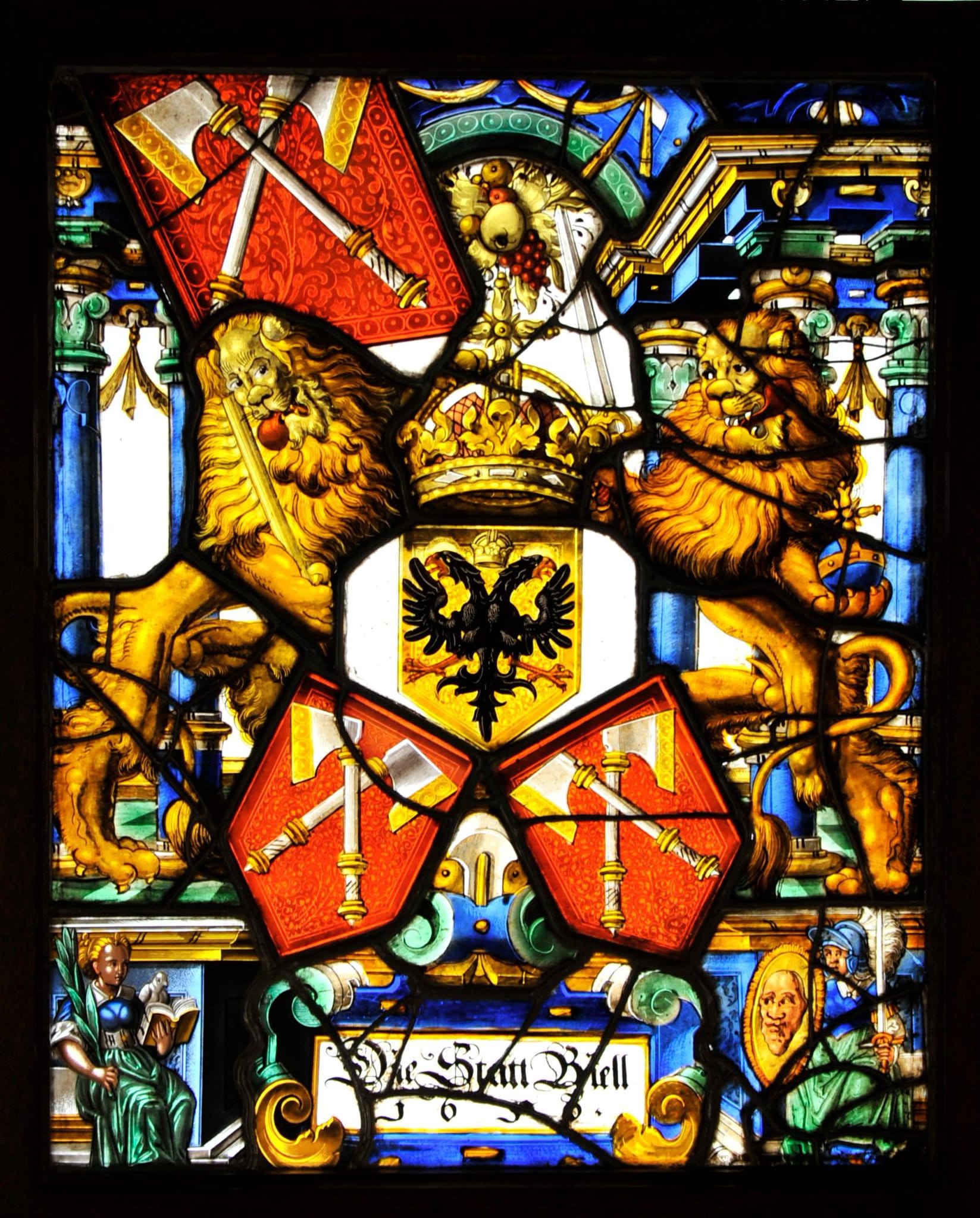 Die Wappenpyramide Biel-Reich steht auf der den Stifternamen enthaltenden Rollwerkkartusche. Sie wird von zwei Löwen begleitet, die über dem Reichsschild gemeinsam die Reichskrone emporheben. Zudem hält von diesen derjenige links in seiner Vorderpranke das Bieler Banner und derjenige rechts das Reichsschwert. Die beiden Schildwächter stehen auf dem grün gefliesten Boden des Podiums. Davor sitzen zu Seiten der Inschriftenkartusche zwei weibliche, in einen langen grünen Rock und ein blaues Hemd gekleidete weibliche Allegorien. Von ihnen gibt sich diejenige zur linken Seite anhand des Palmzweigs und der auf ihrem geöffneten Buch sitzenden Taube als Personifikation des Friedens (Pax) zu erkennen. Ihre mit Schwert und Schild bewaffnete Kollegin, deren Kopf ein stahlblauer Helm mit weissem Federbusch schmückt, verkörpert vermutlich die Kriegsgöttin Bellona (bzw. Athena). Hinter den Wappenschilden und ihren Wächtern erhebt sich vor farblosem Grund eine dreiachsige Architektur aus blauen Rundpfeilern und einem auf dem vorkragenden Gebälk ruhenden Bogen, an dem ein Fruchtbouquet aufgehängt ist.