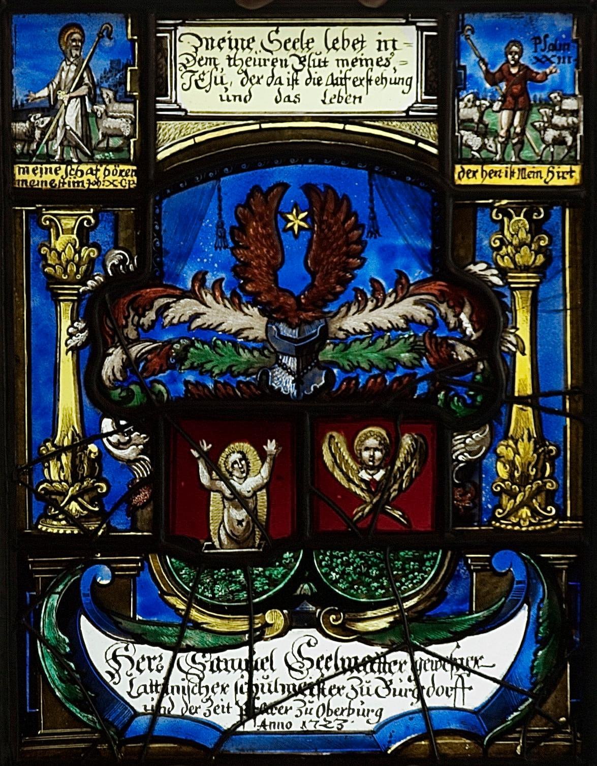 Im Zentrum stehen vor blauem Grund zwei auf die Inschriftenkartusche gesetzte, unter einem Helm vereinte Wappenschilde. Während davon der heraldisch linke vermutlich auf Samuel Seelmatter zu beziehen ist, dürfte der heraldisch rechte symbolisch zu interpretieren sein (s. u.). Die seitliche Rahmung bilden zwei gelbe Säulen vor blauem Grund. Über dem sich über dem Oberwappen hinziehenden Flachbogen befindet sich eine Inschriftentafel mit einer Lobpreisung Christi. Neben ihr erscheinen in einer Landschaft links Christus als guter Hirte (Jo 10, 1–18) und rechts der jugendliche David als Schafhirte (Ps 23).