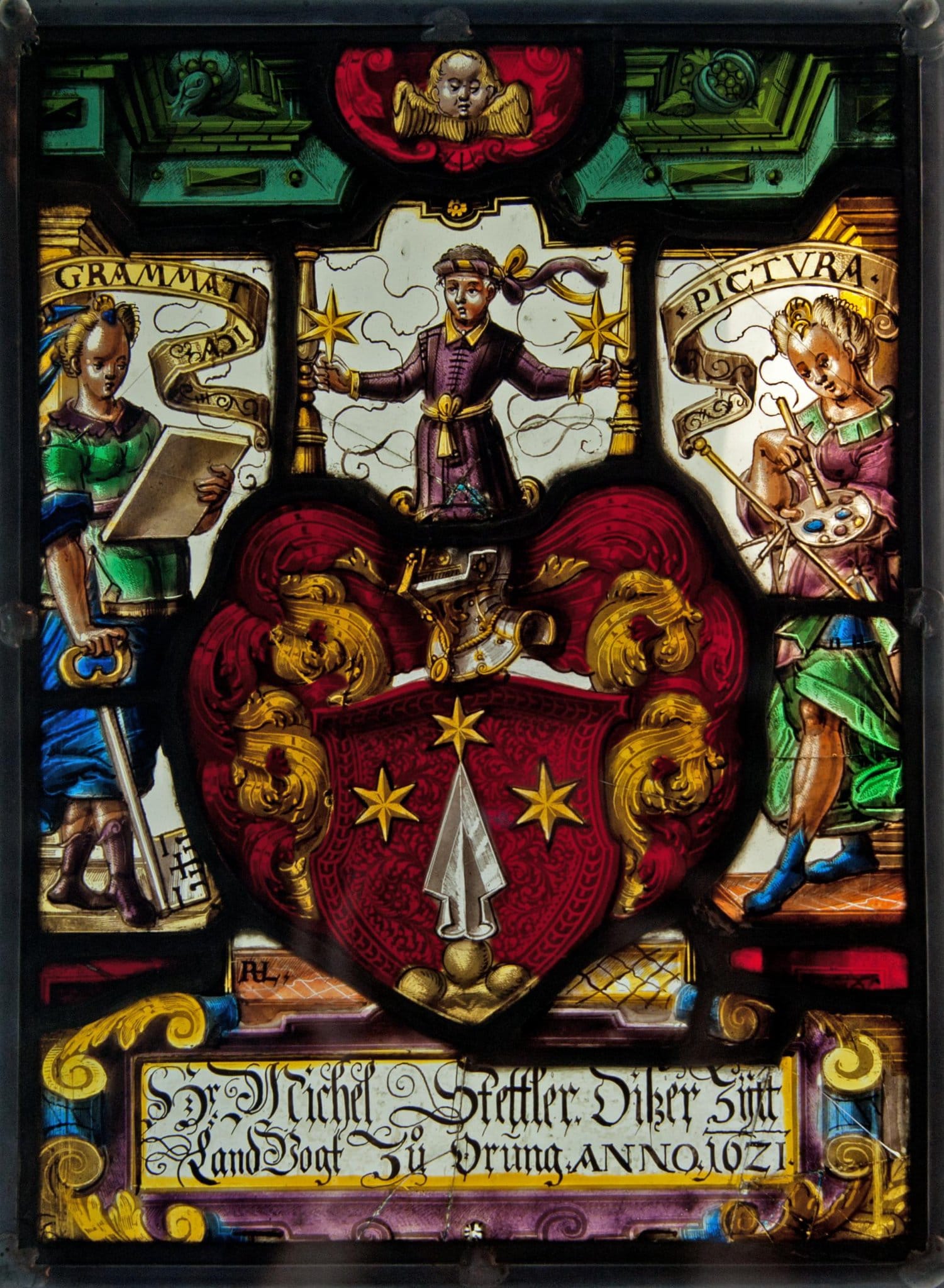 Das vor farblosem, schnurverziertem Grund auf die Rollwerkkartusche mit dem Stifternamen gesetzte Vollwappen Michael Stettlers begleiten die allegorischen Frauengestalten der Grammatik und der Malerei. Hinter diesen erhebt sich eine dreiachsige Architekturrahmung aus schlanken Stützen und einem wuchtigen grünen Gebälk, das eine zentrale rote Rollwerkkartusche mit Engelskopf ziert.