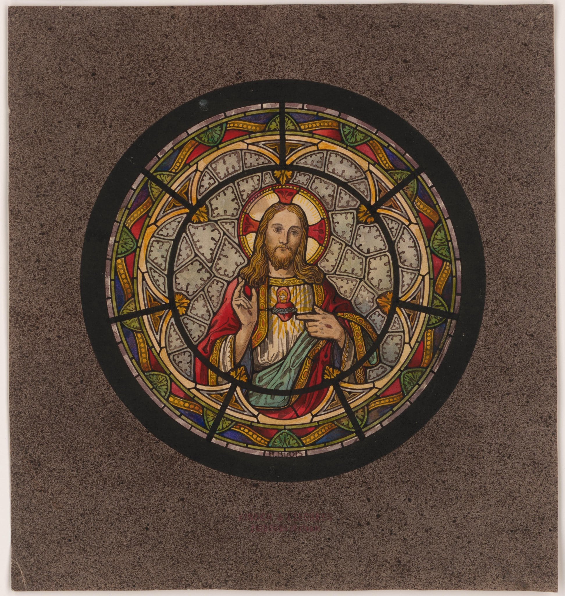 Au centre d’un oculus ornemental, le Christ est présenté de face en buste. Il fait le signe de bénédiction de sa main droite et montre, de sa main gauche, son coeur. Il se présente devant un fond ornemental composé de motifs de feuillages stylisés, divisés en portions de différentes dimensions. Il est entouré de sept lobes et d’une large bordure végétale et géométrique.