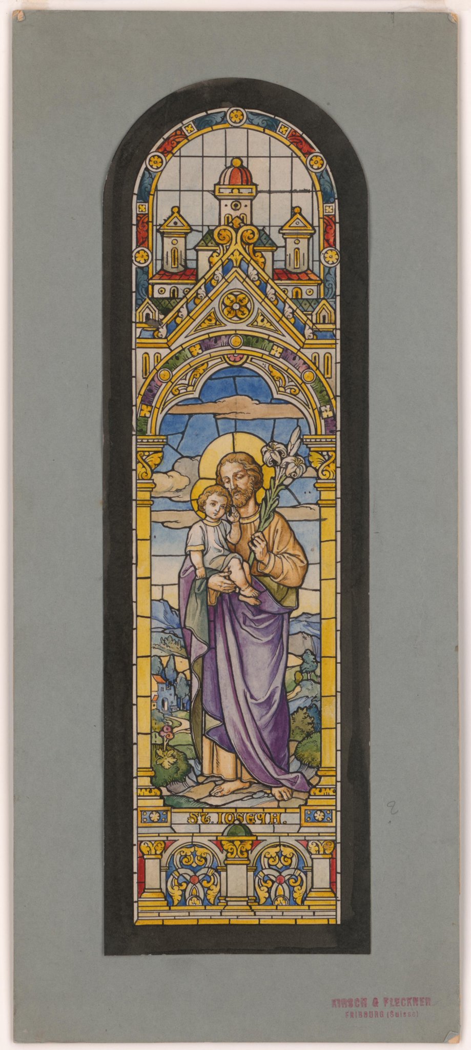 Cette maquette en couleur consacrée à saint Joseph est un dessin détaillé précédent le carton KF_408 en vue du deuxième vitrail à gauche de la nef pour l’église Saint-André à Onnens.