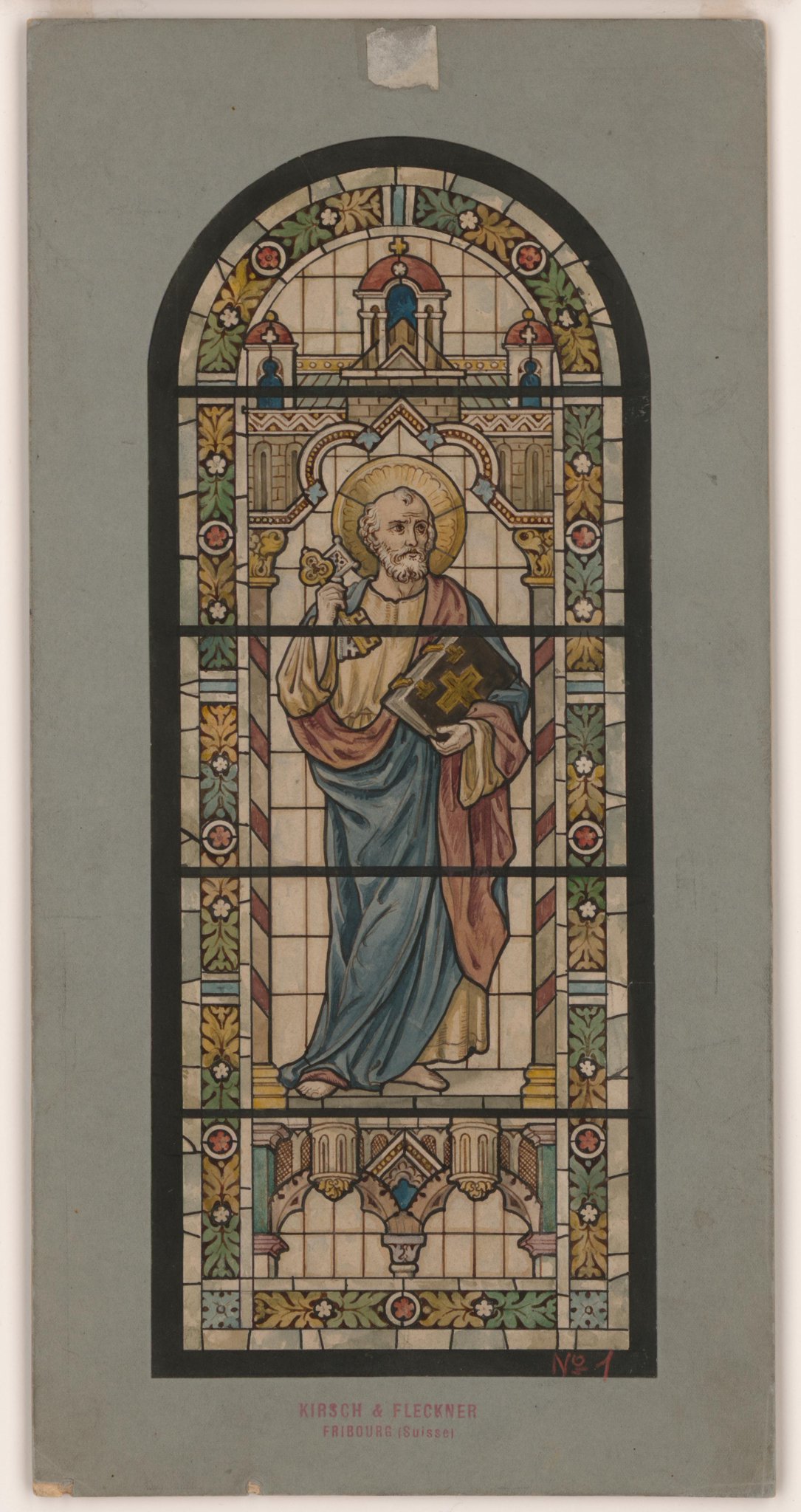 Saint Pierre, debout et présenté de trois quarts, tient de sa main droite deux clefs et de la gauche un livre. Chauve avec une touffe de cheveux sur le devant, il porte la barbe. Il est vêtu d’une toge et d’un manteau. Il est est inséré dans une ouverture composée d’arcs en mitre et lobés surmontée d’une architecture qui se détache dans la partie supérieure sur un fond de vitrerie à bornes rectangulaires. Le tout est entouré d’une bordure à motifs végétaux.